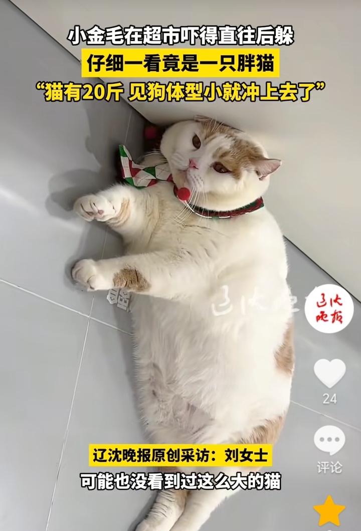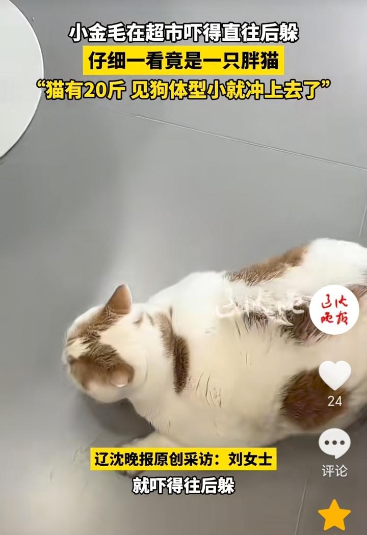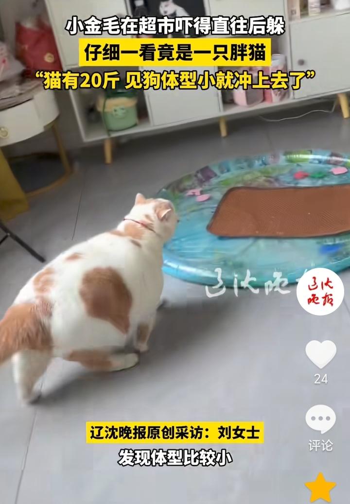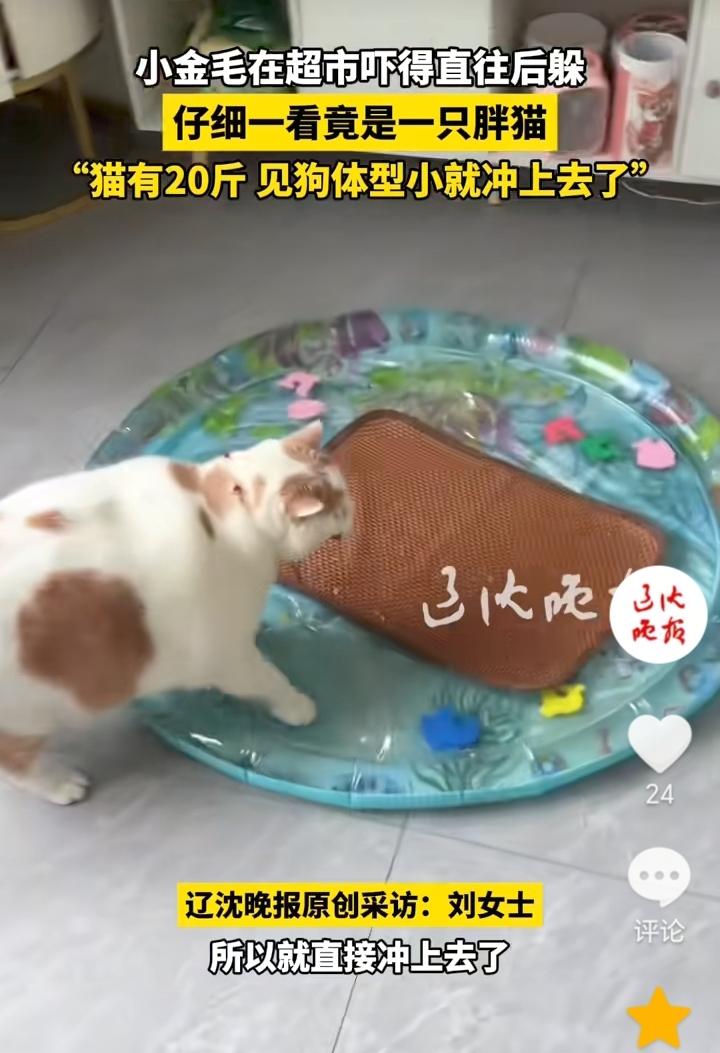 “给狗丢脸了”!辽宁沈阳,主人经常带自己20斤的胖猫去超市,在超市胖猫发现了一只小金毛,胖猫领地意识较强,观察了一会小金毛,发现小金毛体型比较小,所以就直接冲了上去,小金毛可能也是没见过这么大的猫,吓得连忙往回躲。 从猫的体型就可以看出来猫的生活有多好,看着都觉得压迫感十足,小金毛也是比较胆小,算是给狗丢脸了,看到胖猫吓得往回躲。 不过这只小金毛也是有自知之明,知道打不过胖猫就赶紧往回躲,好在主人跟着,不然打起来小金毛就要遭殃了。