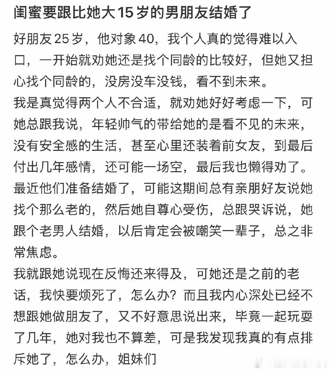 我的闺蜜即将与一位比她年长15岁的男友步入婚姻。