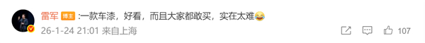 雷军称小米汽车熔岩橙配色敢买的人太少【小米SU7、YU7下架熔岩橙配色 雷军:很帅但敢买的人太少了】快科技1月25日消息,昨晚,雷军发微博赞美熔岩橙配色,这个颜色很帅但是敢买的人太少了。雷军表示,目前小米SU7和YU7都下架了熔岩橙配色。雷军还在评论区里称:“一款车漆,好看而且大家都敢买,实在太难。”官方介绍,小米SU7熔岩橙采用3层喷涂工艺,让阳光点亮座驾非凡的活力。当熔岩橙与阳光交汇于不同角度时,颜色也会发生蓬勃的变化,极具魅力。在小米SU7刚上市时,雷军曾晒出熔岩橙配色照片,他表示:“有品位、足够自信的人才能真正驾驭,开这样的车到北京三里屯,能不能炸街?”(快科技)