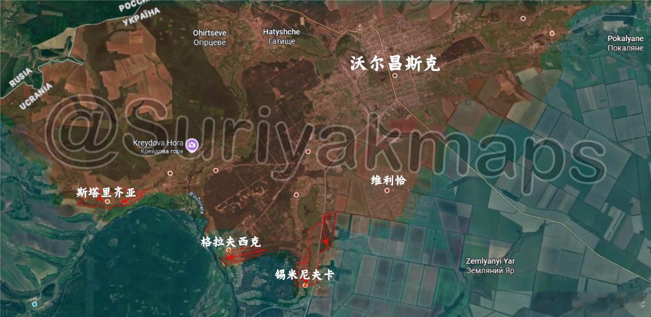 图1这是什么情况,虽然没看太懂,但大受震撼,沃尔昌斯克一线的乌军集体大逃亡了吗?还交叉着跑。但根据1月24日的俄乌局势图,在沃尔昌斯克方向,俄军攻占了部分格拉夫西克和一半的锡米尼夫卡。此外,俄军还收复了大部分斯塔里齐亚(图2)。