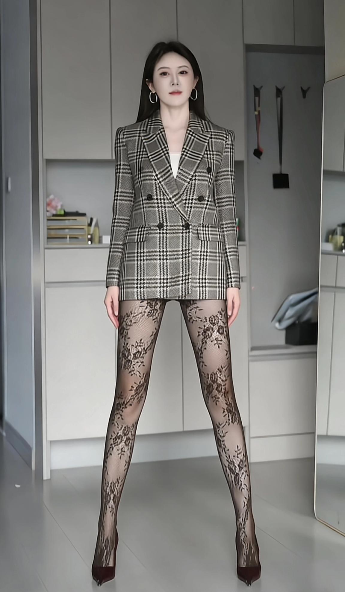 优雅气质穿搭指南:格纹西装+蕾丝丝袜+高跟鞋