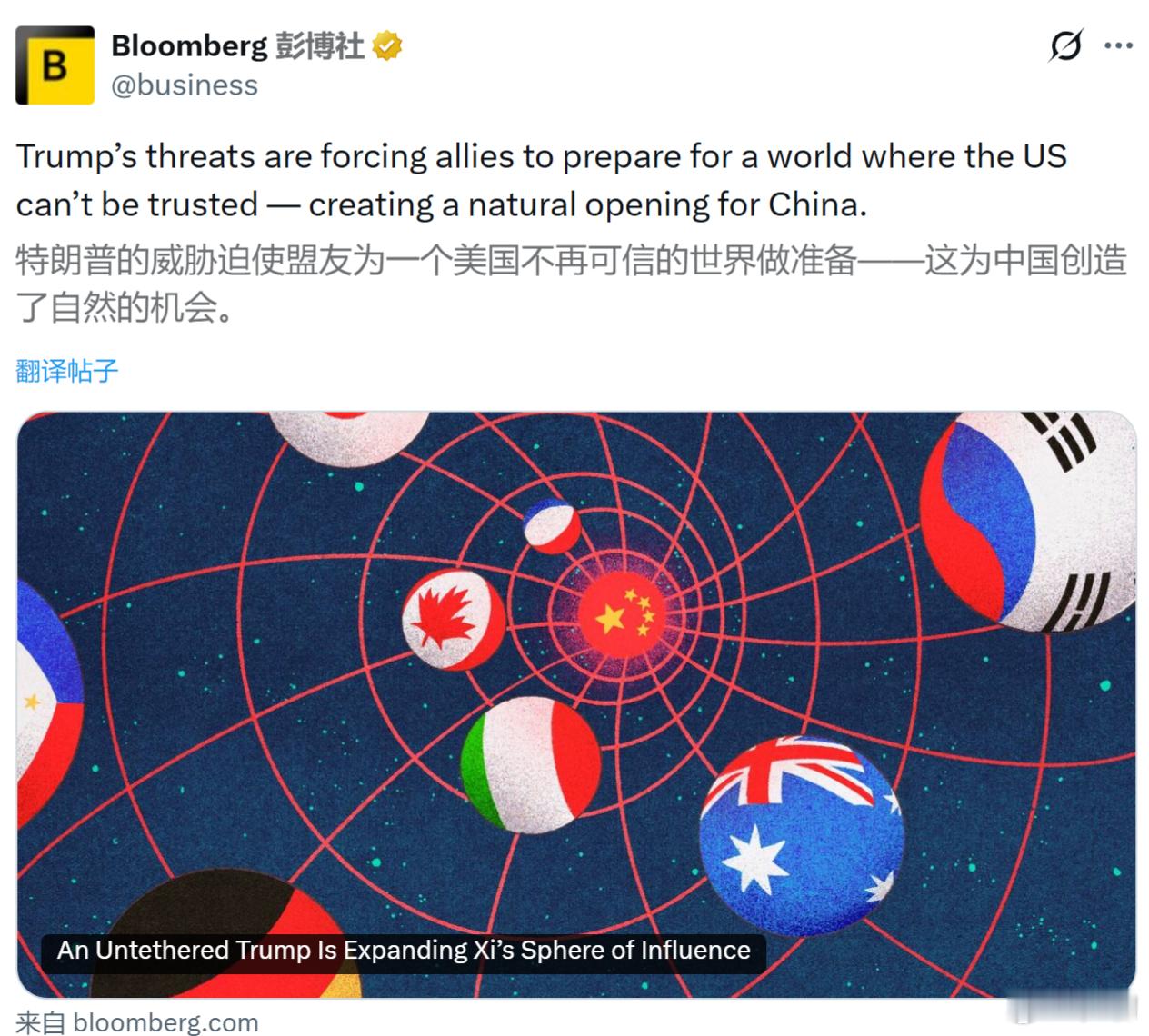 彭博社:特朗普的威胁迫使盟友为一个美国不再可信的世界做准备—这为中国创造了自然的机会。欧洲跟着美国以为对全世界都可以为所欲为,直到它们遇见了中国和俄罗斯。而美国终于发现,只要不去挑战中国和俄罗斯,它在全世界真的可以为所欲为,包括欧洲。