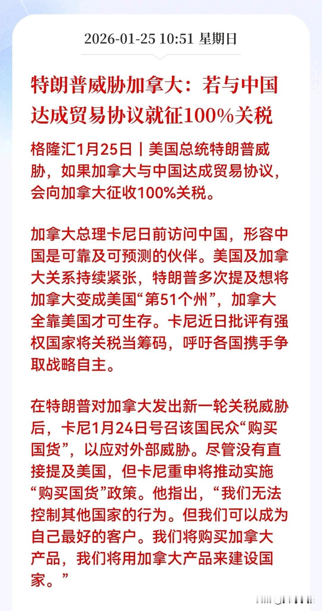 川普再显“霸道总裁”风范,关税大棒挥向枫叶国,威胁其与东大做生意,就加征100% 关税,称要把枫叶国纳入美丽国第51州的版图!面对美丽国的威胁,枫叶国只能低声下气的回应:“购买国货”,强调用加拿大产品建设国家!看来枫叶国成为美丽国的第五十一州已经不远了,老话说的好:不怕贼偷就怕贼惦记!