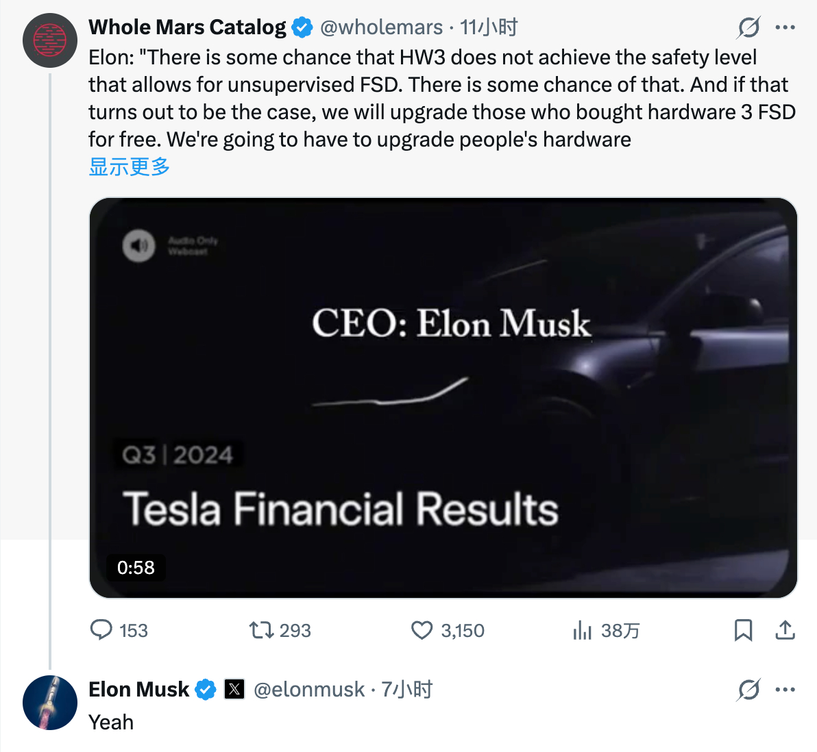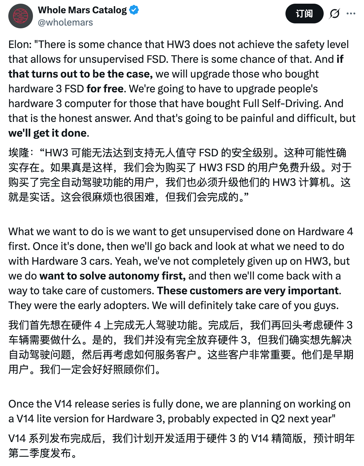 Elon Musk 重申:特斯拉将为所有选装了 FSD 的 HW3.0 车主提供 FSD 完全自动驾驶功能,如果硬件无法支持,特斯拉将进行免费的硬件升级以提供这一功能。具体的执行是,特斯拉先基于 HW4.0 平台实现 FSD,然后回头解决 HW3.0 的问题。特斯拉 AI 副总裁 Ashok 去年的承诺是,在 FSD v14 推送完成后(目前还有 FSD v14.3 子版本尚未推送),特斯拉将基于 HW3.0 平台开发 FSD v14 Lite,计划于今年 Q2 推送。这个时机比较有趣,这番表态实际上是在 2025 年 Q3 的特斯拉财报会议,具体时间是去年 10 月,首次公开的。最近 Elon 宣布特斯拉将于 2 月 14 日下架 FSD 买断,仅提供订阅,许多用户怀疑特斯拉试图借此彻底摆脱和抛弃 HW 3.0 用户,Elon 这个回复对很多老车主来说,非常重要。回到国内,2019 年特斯拉 Model 3 进入中国不久,就全线切换了 HW3.0,可以说中国两百多万特斯拉车主中,95% 以上是 HW3.0 和 4.0 车主。于情于理,FSD 叫 Full Self-Driving,用户花钱买了这个选装包,迟来的解决是亡羊补牢,好过假装无事回避掉。很多老用户当年都出于信任花钱买了这个选装包,比如著名 Model 3 车主话说回来 HW3.0 到 4.0 的计算平台、传感器、供电、执行器、布置完完全全不同,很难想象这种硬件升级如何操作,距离 Q2 也就两个月了,看特斯拉接下来的方案。
