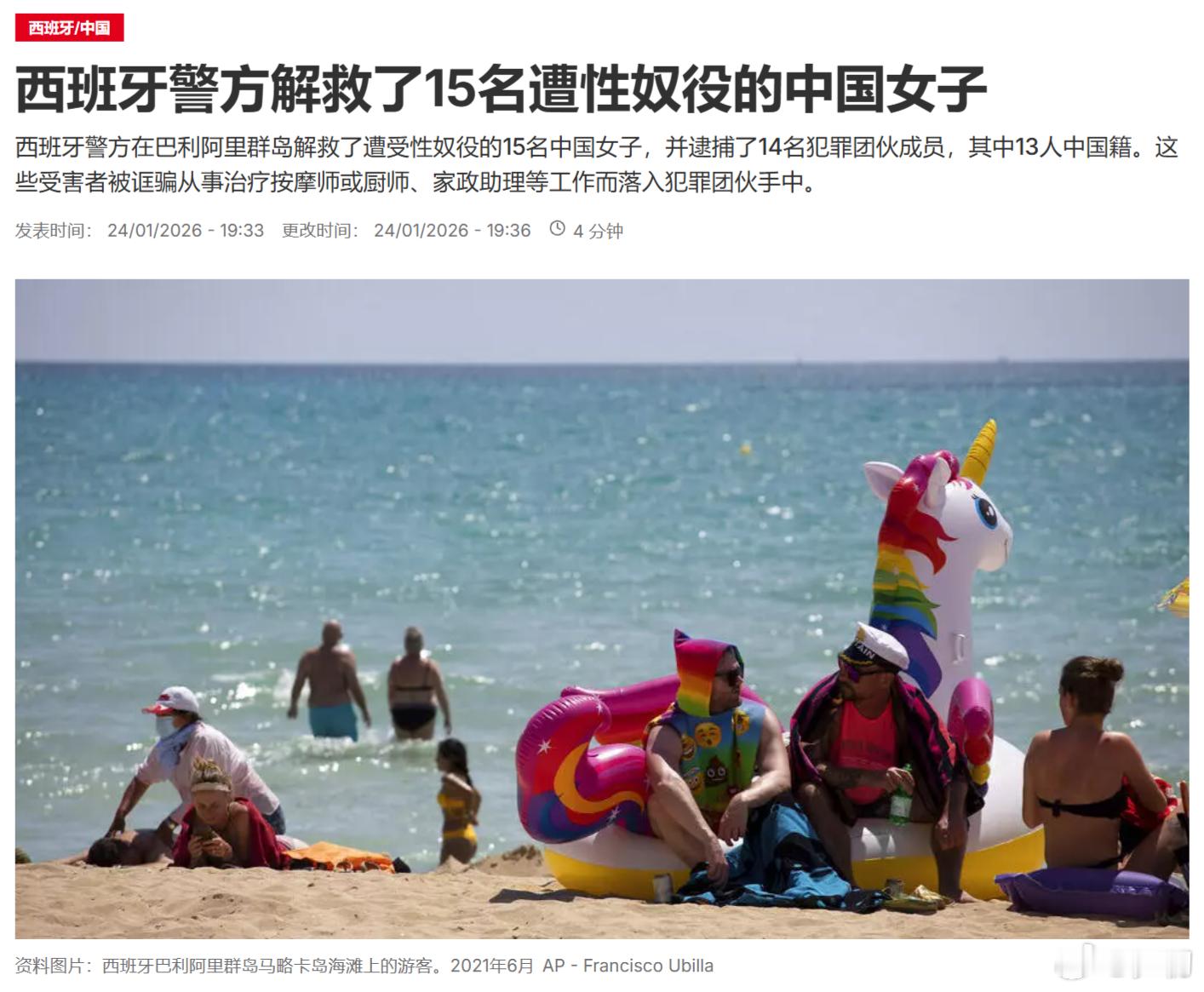 美联社:西班牙警方在巴利阿里群岛解救了遭受性奴役的15名中国女子,并逮捕了14名犯罪团伙成员,其中13人中国籍,一人为西班牙籍。这些受害者被诓骗从事治疗按摩师或厨师、家政助理等工作而落入犯罪团伙手中。