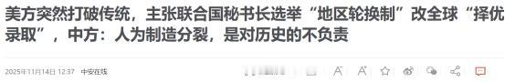联合国乱了?2025年11月14日,美方突然打破传统!致使联合国出现混乱,中方看破美国心思! 联合国是一个国际组织,而秘书长就是联合国的首席执行官。联合国秘书长担负着重要的责任,不仅负责协调联合国各机构的工作,更要负责推动国际的合作与和平。 即便没有明确的正式规定,但为了保证联合国的公平性。联合国秘书长的选举形成了一个传统的规则,那就是大洲轮换。 据悉,这一任的联合国秘书长即将到期。所以自2027年1月1日起,就要选出新一任联合国秘书。也正因此,联合国境内掀起了大乱。 就在2026年11月14日的时候,第80届联合国大会进行了有关联合国决议和振兴联大议题的联合辩论。在这次的会议中,我国常驻联合国副代表耿爽大使就重磅发言,直接戳破了美国的小心思。 原来就在此前,美国常驻联合国代表提出打破传统的地区轮换制,主张在全球范围内“择优录取”候选人。美国的这一举动目的非常的明显。 针对美国的这一主张,耿爽大使直接强调《联合国宪章》,联大决议和安理会文件对选举程序有着明确规定。以此做出中方表态,会员国应该遵循,坚持,不刻意的去寻求突破。 美国的小心思简直就是太明显了,究竟是真的为了择优录取,还是为了一己私利,这一点相信很多人能够明确感知到。目前联合国秘书长的选举流程已经启动,竞争也已经开始,不知这一次的联合国秘书长会花落哪个国家? 对此,您怎么看? (信息来源:美方突然打破传统,主张联合国秘书长选举“地区轮换制”改全球“择优录取”,中方:人为制造分裂,是对历史的不负责-中安在线) (信息来源:中方就加强和振兴联大工作提出三点建议-新华网)