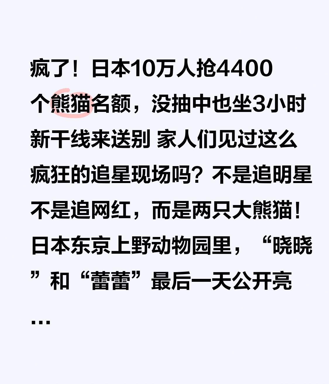 疯了!日本10万人抢4400个熊猫名额,没抽中也坐3小时新干线来送别 家人们见过这么疯狂的追星现场吗?不是追明星不是追网红,而是两只大熊猫!日本东京上野动物园里,“晓晓”和“蕾蕾”最后一天公开亮相,4400个参观名额被10万人疯抢,中签率比高考还低,24.6倍的争抢热度直接把动物园官网挤崩溃! 更让人破防的是,不少没抽中名额的日本人,特意从九州、北海道坐3小时新干线赶来,就为了在动物园外远远站一会儿,感受送别氛围。上野松坂屋的留言墙被贴得严严实实,侧面都叠满了纸条,“谢谢你们带来的快乐”“会去中国看你们”的字迹,有老人的工整楷书,也有小朋友歪歪扭扭的涂鸦,连中国网友看了都忍不住说“这爱意太纯粹了”。 可热闹背后,藏着让人揪心的转折点。为了榨干最后价值,动物园把参观时间压缩到每个点位仅1分钟,每天开放12小时让熊猫高强度“营业”,还推出近百种限定周边疯狂圈钱。有细心的网友发现,“晓晓”和“蕾蕾”出现了反复踱步、频繁舔爪的刻板行为,这可是动物长期应激的“求救信号”——它们本该在竹林里悠闲啃笋,却成了被闪光灯和人群包围的“赚钱工具”。 其实这已经不是熊猫第一次在日本引发轰动了。从1972年首批熊猫赴日开始,几代日本人都是看着熊猫长大的,它们甚至成了2011年东日本大地震后的“治愈担当”。“晓晓”和“蕾蕾”的名字,还是从19万件民众投稿里选出来的,寓意“黎明来临,迎接美好”,这份跨越国界的喜爱,本来是最动人的民间纽带。 好在中方果断决定提前接它们回家,不仅安排30天隔离监测心理状态,还准备了专属基地和十余种竹子适配饮食。就像外交部发言人说的,欢迎日本民众来中国看大熊猫——真正的喜爱,从来不是强行挽留,而是给它们适合的生活。 看到日本人含泪送别的样子,突然明白:熊猫从来不是普通的动物,而是跨越语言的善意使者。你被这份跨国喜爱打动了吗?如果有机会,你愿意去四川看大熊猫吗?评论区聊聊你的想法,点赞转发,让更多人看到这份纯粹的美好!