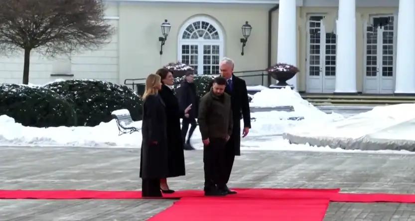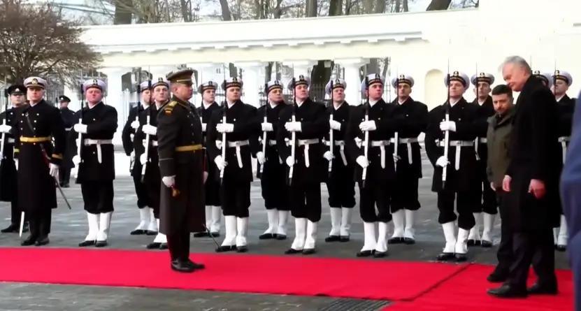 乌克兰总统泽连斯基访问立陶宛,立陶宛可够重视的,机场为泽连斯基夫妇铺设了红地毯,赠送了鲜花,不过,泽连斯基的飞机旋梯处没有铺设地毯。 立陶宛还为泽连斯基举行了隆重的欢迎仪式,为了迎接泽连斯基,立陶宛提前扫清了积雪,不过感觉铺的红地毯有点窄,泽连斯基和瑙塞达站一起站上去看着有点挤,瑙塞达个子也很高。不管怎么样,立陶宛的付出得到了泽连斯基的肯定。