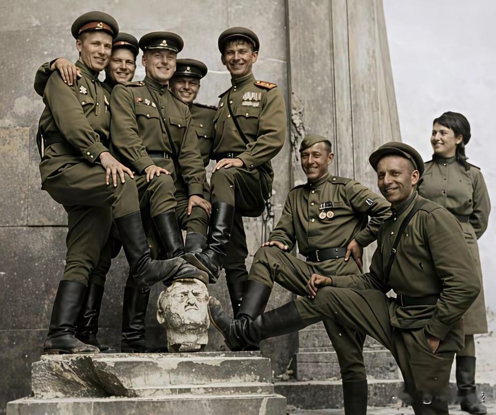 看这些军人的服装,应该是苏联红军,这应该是在第二次世界大战期间,他们攻入德国后,留下的这个画面,这张照片拍摄的的确非常经典,见证了那个历史时刻!以前曾经看过一本书,书名叫《最后100天》,书中详细描写了苏军攻入柏林的情况!
