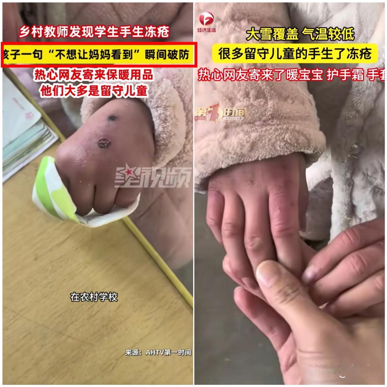 看着都心疼! 河南乡村老师课间发现,几个留守儿童手上长满冻疮,孩子却 懂事地说“不想让妈妈看见”,怕远在外地的爸妈担心。 这些孩子大多跟着爷爷奶奶生活,老人要顾好几个娃,难免顾不上细节,冻疮悄悄长了都没发现。 老师把视频发上网后,爱心人士纷纷寄来护手霜、手套,暖了孩子也暖了人心。 父母外出打工是为了生活,可孩子的童年只有一次。 再忙也别忘多视频、多关心,别让懂事的孩子,把委屈藏在冻疮里。 你身边有这样的留守儿童吗?觉得该怎么帮他们更好?留守儿童 长冻疮
