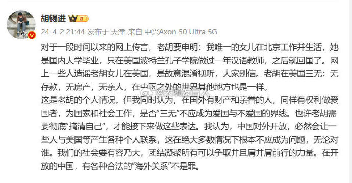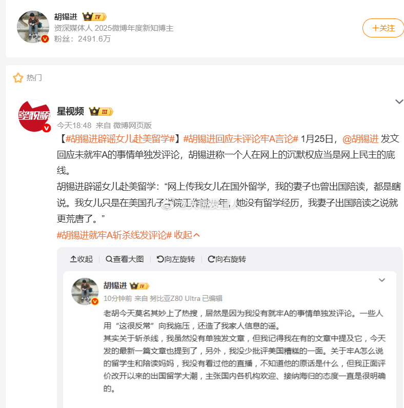 转发“星视频”的微博:胡锡进辟谣女儿赴美留学(图1) “我女儿只是在美国孔子学院工作过一年,她没有留学经历,我妻子出国陪读之说就更荒唐了(完整内容见图2)”巧了,我昨天刚发过一条胡锡进2024年发的微博,老胡当时就公开承认过,“女儿曾在美国波特兰孔子学院当过一年汉语老师(图4)”,我昨天疑惑喜欢评论热点的胡老师,为什么这一次没有评论搅动起对美国斩杀线热议的牢A事件胡锡进回应未评论牢A言论,胡锡进就牢A斩杀线发评论,热点观点
