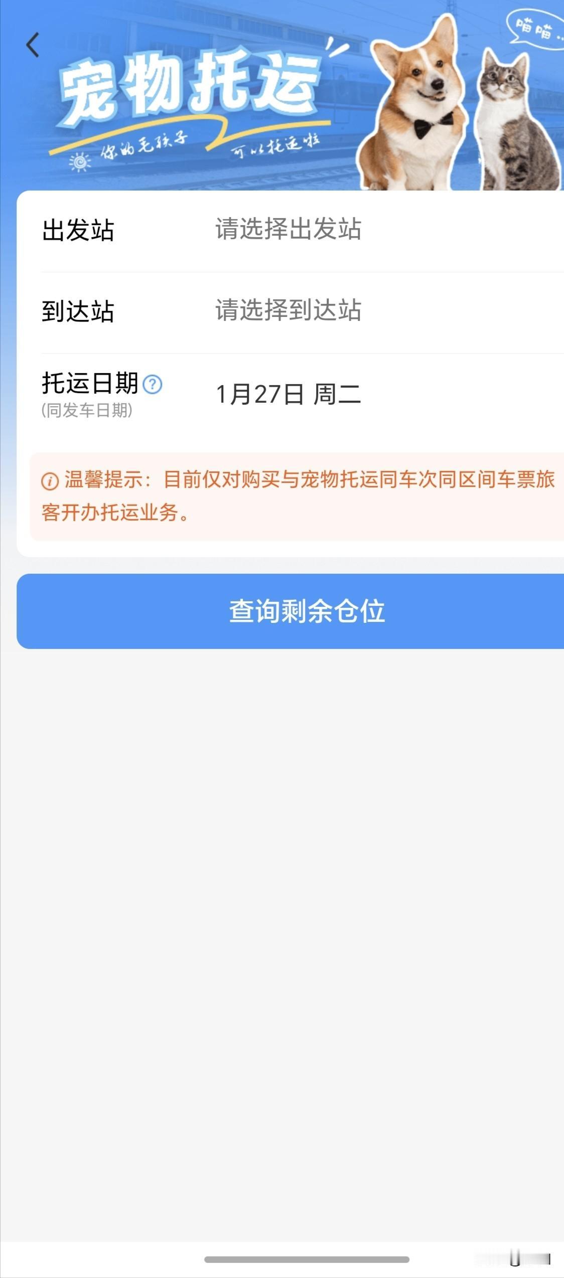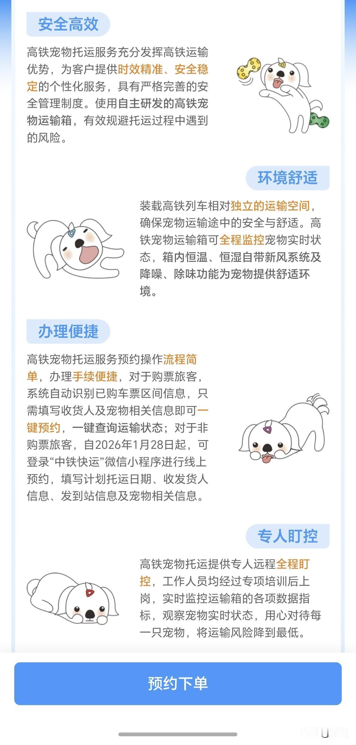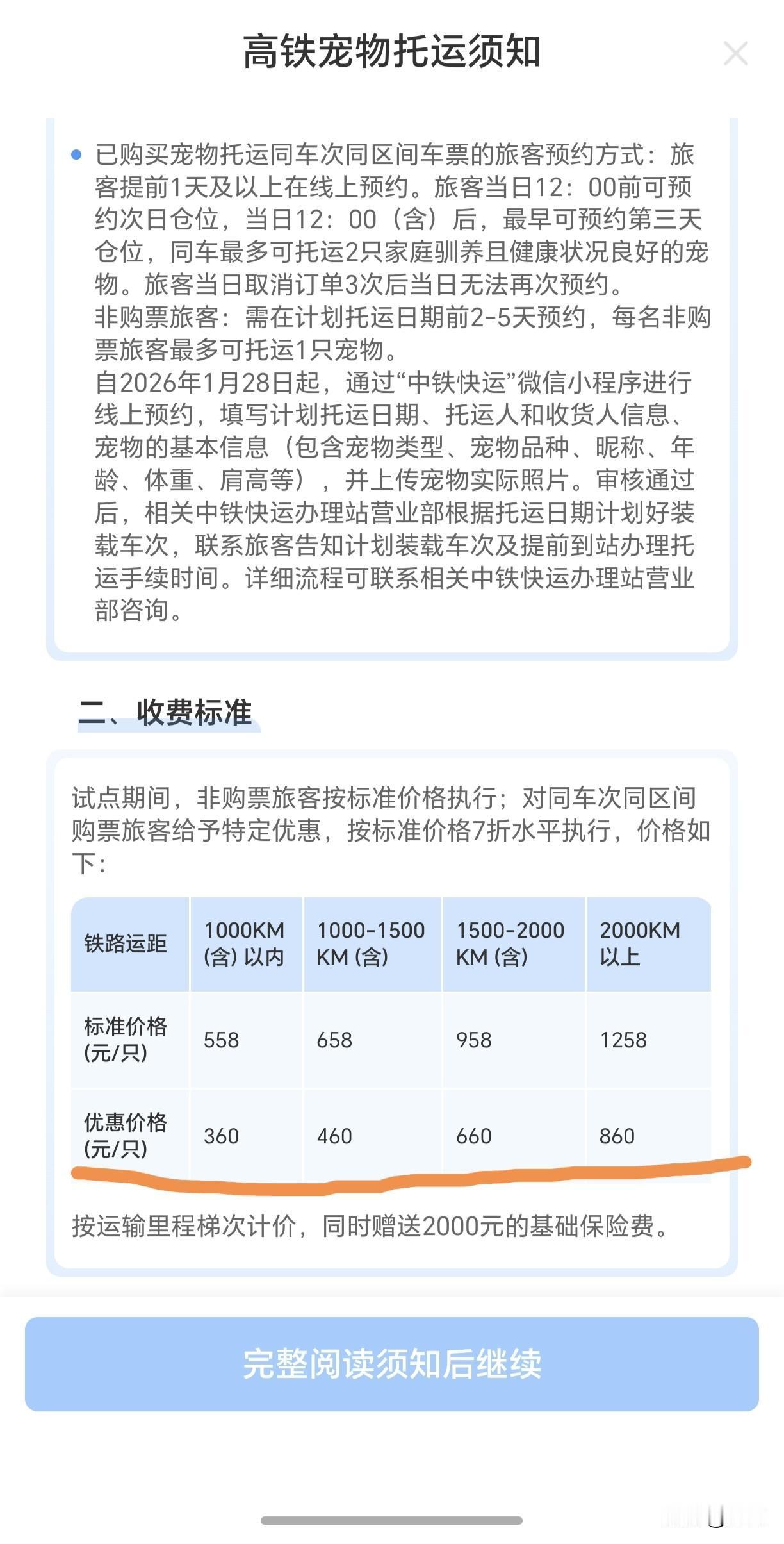 早上上班,同事说:“我去,高铁政策越来越人性化了。” 我:??? 他说:“本来我还在想,过年回家,养的猫如何安顿,结果今天就看到一个新政策,宠物可以坐高铁了,支持托运回家。” 于是,我搜了一下相关政策。 购票时:买带“宠”字的车次,乘车人与托运人身份一致;每人最多托运2只 。 乘车人买完车票后,必须得点击【宠物托运】进行预约下单。  预约规则是:12:00前约次日仓位,12:00后约第三日;仅对已购车票旅客开放,需关联本人车票 。 [看]操作:点预约下单→选出发/到达/日期→查剩余仓位→选可预约车次并关联车票→填托运人/收货人/宠物信息(类型、品种、体重、肩高、照片)→提交订单→等待审核(8:00-20:00提交约2小时内出结果,20:00后次日8:30前审核) 。 ​ 提示:审核通过收短信;退改签车票会自动取消宠物仓位 。 ⚠️ 这些宠物会放在专门的铁路专用箱,人宠分离,期间不得探视。 到站后凭短信/电话提示,携本人身份证去到站中铁快运营业部领宠;及时检查宠物状态 。 当然,宠物托运并不是免费的,不同的里程数,托运费用是不一样的,比如一千公里以内是360元,一千公里到两千公里之间460元。 说真的,周围的单身同事养猫养狗人士越来越多了,包括北京合生汇开了一家超大型的宠物超市,你去店里溜达,不但能看到琳琅满目的零食,还能听到很多人抱着自家猫狗说“想吃这个吗?妈妈给你买?” 全程非常有耐心的引导小狗小猫自己选择,完全把猫狗当做孩子去养,比起那些养一段时间就丢弃的人,这种人真的很有爱心❤️。 高铁推出宠物托运服务,着实是顺应生活趋势的暖心举措。 不再让铲屎官们面对出行与陪伴的两难,这份兼顾规则与需求的调整,妥妥的与时俱进,越做越人性化了。 高铁 高铁宠物专列 高铁禁止带狗 带宠物乘高铁 高铁宠物运输 高铁运输宠物 宠物高铁票 高铁运宠物 高铁运送宠物狗 高铁客乘服务 高铁宠物 高铁带宠 带宠上高铁 高铁宠物托运箱 动车带宠物 高铁养狗 携宠乘坐高铁 高铁随行宠物狗 高铁小狗 老人带狗坐高铁 高铁猫