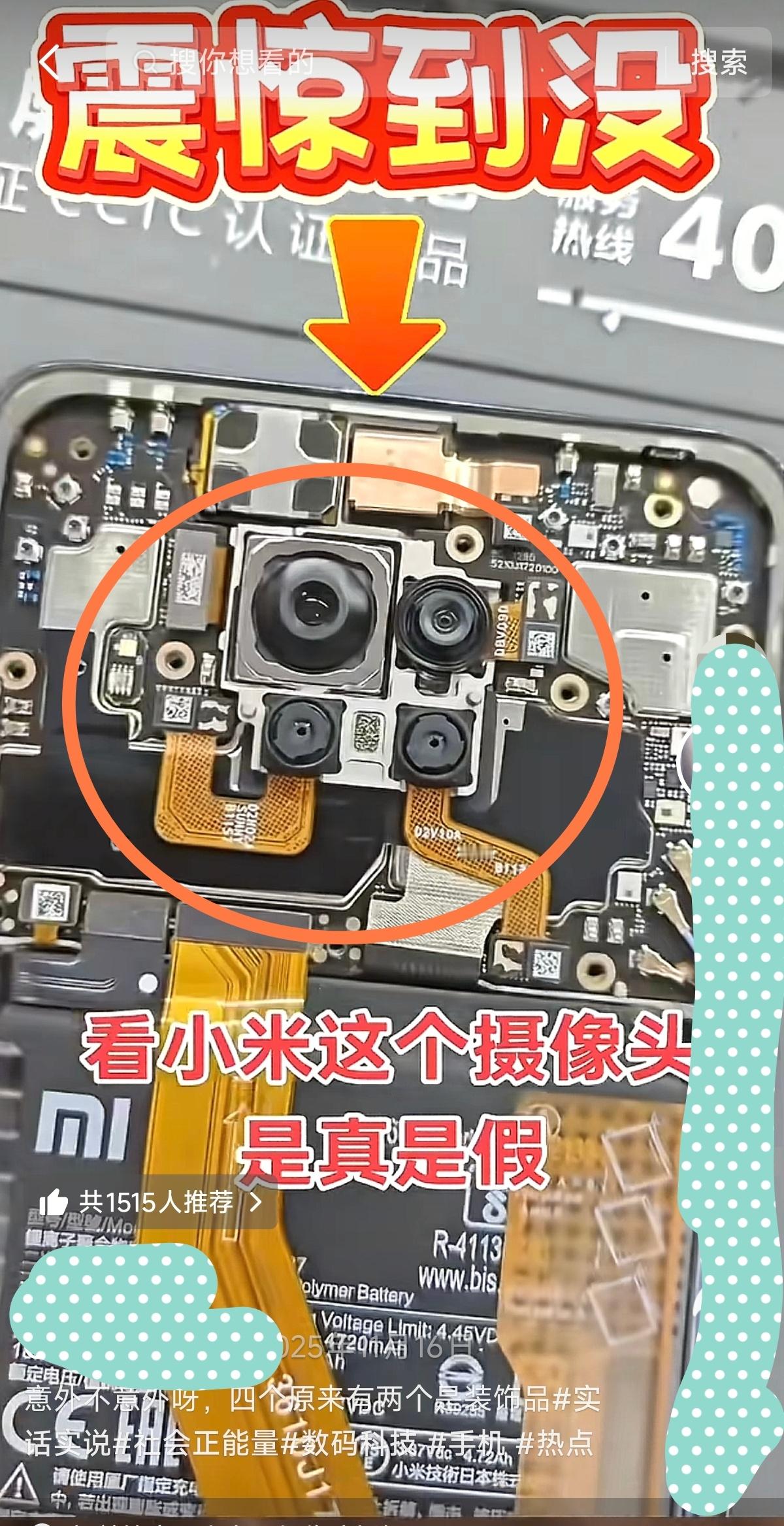 比“多花1000元买了一张贴纸”更离谱的内容来了!“红米Note9 Pro摄像头,有两个是装饰品”。昨天,刷到一个视频,上来开头直接来一句:“军看视频”。紧接着就是一台红米手机的拆解视频,并配文字“看看小米这和摄像头是真是假”。然后,这位视频博主就直接下结论:看完视频我震惊了,四个摄像头,两个装饰品。本来想一起骂小米,不好好做手机,弄装饰品忽悠消费者,可仔细看了视频内容,这不就是一台红Note9Pro手机吗?当年还给了家里人买了两台,记得这款手机摄像头很强,没有装饰品。仔细查看原视频,查了小米官方资料,找了博主微积分的拆解视频,这就是一台红米Note9Pro手机,四颗摄像头分别是 108MP 三星HM2+8MP超广角+2MP微距+2MP景深。红米 Note9系列是2020年12月1日发布的产品,共有Note9 4G、Note 9 5G和Note 9Pro三个版本,镜头模组均不同。这群人,他们到底想干啥?断章取义 2018年的小米8透明探索版,“多花1000元买了一张贴纸”。恶意造谣,2020年红米Note9Pro 四颗影像模组两个是装饰品。新年刚开始,你们真要动起来了!小米科技小米汽车