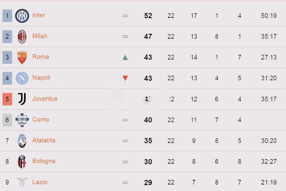 22轮过后,意甲已大势初定!!国米虽然遇强不胜,但凭50个进球的超群攻击能力,靠虐菜一骑当先,5分领跑积分榜。 AC米兰凭借阿莱格里式1-0主义,意甲最少输球场次(1场)跟随其后,踢法虽丑但稳,老而蜜辣。 罗马昨夜虽然没拿下阿囧,但能够1-1扳平比分,凭意甲最少丢球(13个)落后米兰4分,排第三,科内的含金量还在提升。 铁血孔蒂的那不勒斯已经伤病满营,已被斯帕莱蒂的尤文3-0追上并击溃,现在水手尤文两队积分就差1分而已。 这之后,是大打攻势足球法布雷加斯的科莫(40分) 我个人是希望小法的球队能进前四的,他会给意大利在欧洲争面子争积分。但是,40-47这个积分区间毕竟云集了五个队,他们将和国米一起争夺前四的欧冠席位。六进四,争夺还是比较剧烈的,第五踢欧联杯,第六踢欧附加赛。 国米情况最有利,可以说,齐沃半赛季实现了赛季初承诺的下限。这赛季齐沃学会打意甲,下赛季齐沃尝试打欧洲,慢慢来,不捉急。好事不在忙上。