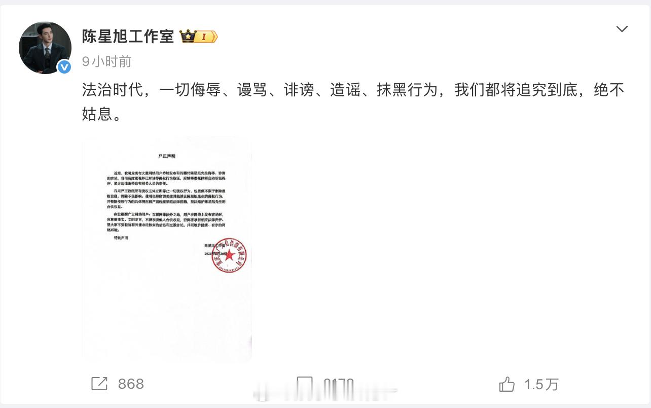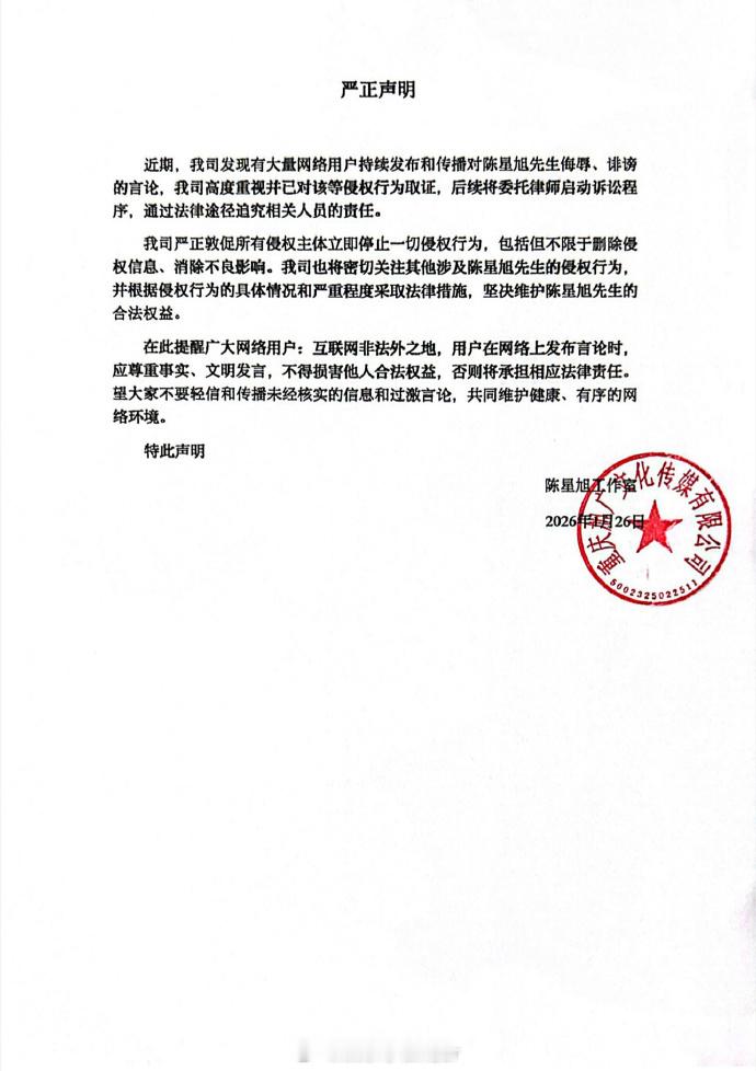 陈星旭工作室声明陈星旭工作室已取证 严正声明:“法治时代,一切侮辱、谩骂、诽谤、造谣、抹黑行为,我们都将追究到底,绝不姑息。”