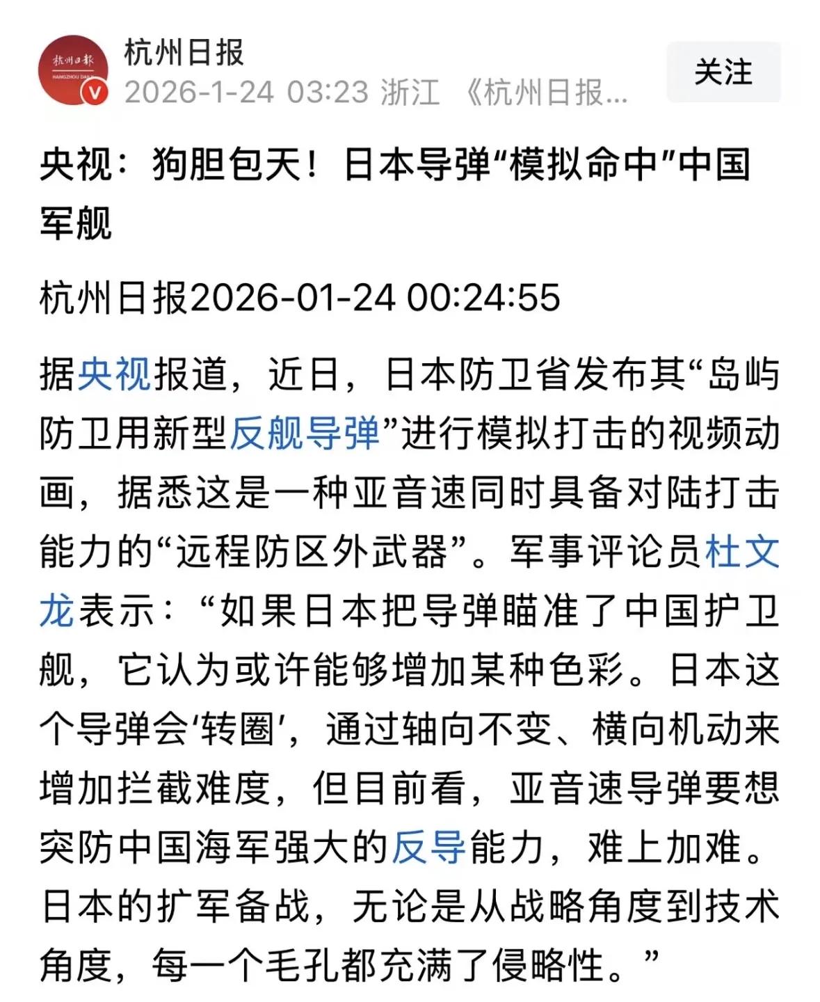 近期,日本模拟导弹命中中国军舰。 日本防卫省发布了一段岛屿防卫用新型反舰导弹的3D模拟动画,视频中这枚导弹精准命中了一艘中国海军054A型护卫舰。 首先明确的是,这不是一次实弹射击,而是一场精心制作的攻心战。日本想告诉我们,他们有能力打击我们。 日本在这段视频当中炫耀了他们导弹拥有的超强机动性,也就是所谓的导弹末端的桶滚式机动,这种机动是指导弹能够横向螺旋飞行,避开防空系统的拦截。 他们展示的这款导弹是12式岸舰导弹的深度改进型。 一来是彰显武力,二来也暴露了日本所谓的岛屿防卫策略,完全是扯淡。 这种导弹从200公里的射程暴增到1000公里以上,甚至可以达到1500公里,明显的具有攻击性,明显没有防御性质。 不过,这种导弹的威胁性对于中国来说并不大。 因为这只是一款亚音速的导弹,飞行速度慢就是他们最大的死穴。 至于所谓的超强机动,也被亚音速的速度拖了后腿。 这就好像是,你跟李小龙打拳击,你的花架子很多,但是你出拳的速度很慢,有什么用呢? 所以咱们的军事评论员杜文龙说,在绝对的力量面前,所有的花拳绣腿都是笑话。 这话真的是一点都没错! 而我们央视对日本的这个行为,直接给了一个非常罕见的评论,狗胆包天! 不得不说,咱们官方媒体这些年真的是越来越犀利,用词也越来越直接,毫无前些年的韬光养晦的委婉。