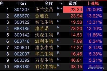 尼帕病毒消息刺激, 抗生素龙头鲁抗医药封板, 这就是肌肉记忆的力量! 尼帕病毒属于mRNA链条, 疫苗股直接起飞: 华兰疫苗、智飞生物、金迪克、康希诺、沃森生物排排坐! 短期消息刺激, 能走多远看资金态度! 因为疫苗板块的筹码跌透了, 若是资金做一波情绪行情是大有可为的。 …