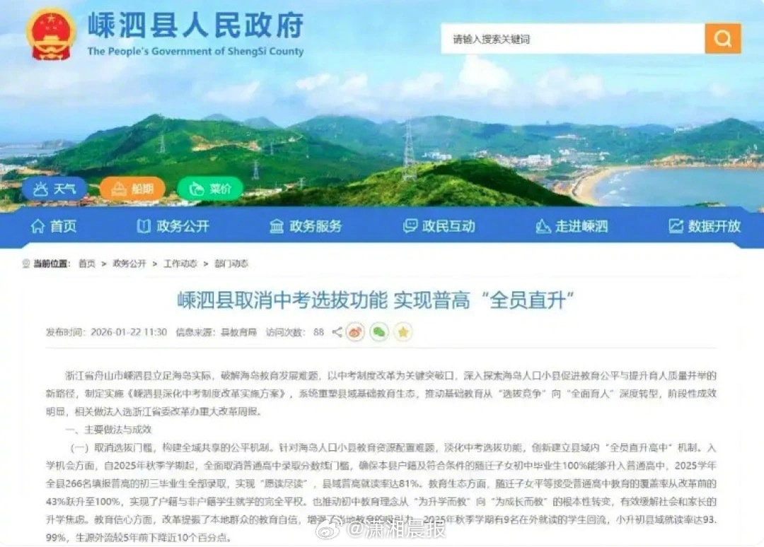 【#教育局回应嵊泗县被指取消中考选拔#,#县教育局称淡化选拔不是取消中考#】1月22日,嵊泗县教育局发文《嵊泗县取消中考选拔功能 实现普高“全员直升”》。文章介绍,该县立足实际进行中考制度改革,取消选拔门槛,淡化中考选拔功能,创建县域内“全员直升高中”机制。“自2025年秋季学期起,全面取消普通高中录取分数线门槛,确保本县户籍及符合条件的随迁子女初中毕业生100%能够升入普通高中,2025学年全县266名填报普高的初三毕业生全部录取,实现“愿读尽读”,县域普高就读率达81%。”公开资料显示,该县由海上的多个岛屿组成,人口6万多,全县仅有一所普高(嵊泗中学),其为省级特色示范高中,2024年招生230人。除了这所普高,还有一所职业中学,2024年招生为36人。该县2025年普高招录办法显示,嵊泗中学招生坚持“综合评价、尊重志愿、愿读就读”的原则。此外,该高中设有“科创特色班”,人数不超80人,其招录按照以“分数优先、择优录取、阳光招录”为原则。1月26日,潇湘晨报记者看到,该则文章已从官网删除。记者致电嵊泗县教育局,工作人员表示,他们县只有一所普高和一所职高,往年填了普高志愿的学生,会存在有人因为分数不够考不上的情况,改革后的2025年就不存在这种了。该工作人员强调,此次改革是“淡化中考选拔功能”,“不是取消,中考还是要考的。”至于科创特色班,是分层分类教学、因材施教的一种设置,该班不能理解为重点班,“它有时候也会有走班等情况。”由于受到广泛关注,会考虑后续做解读。潇湘晨报·晨视频记者於广强 舟山·嵊泗
