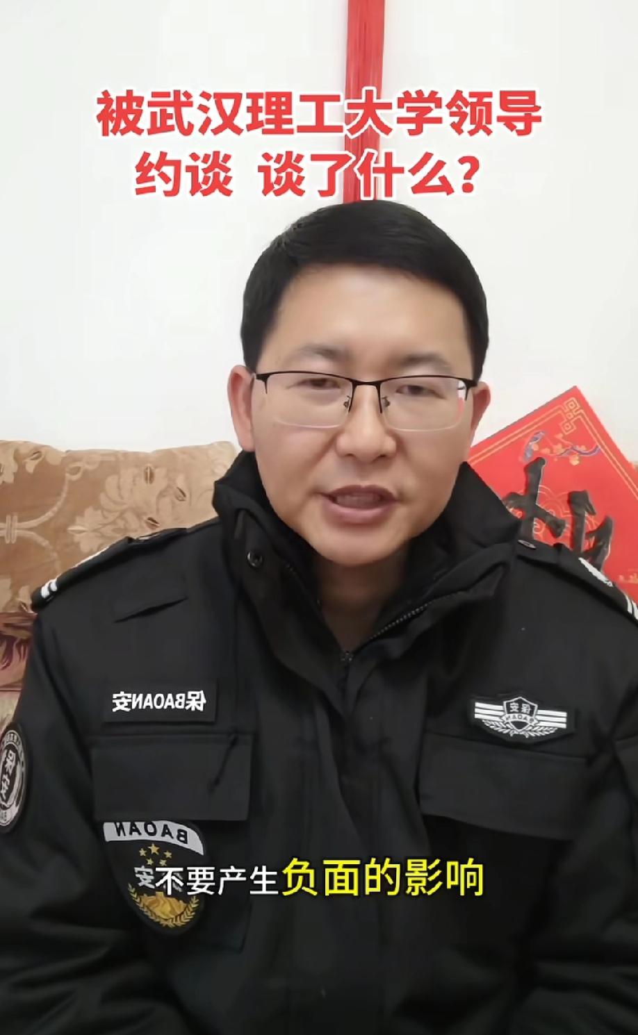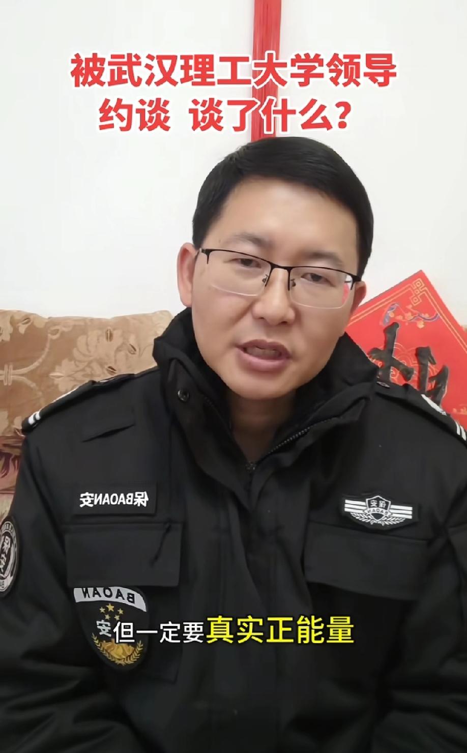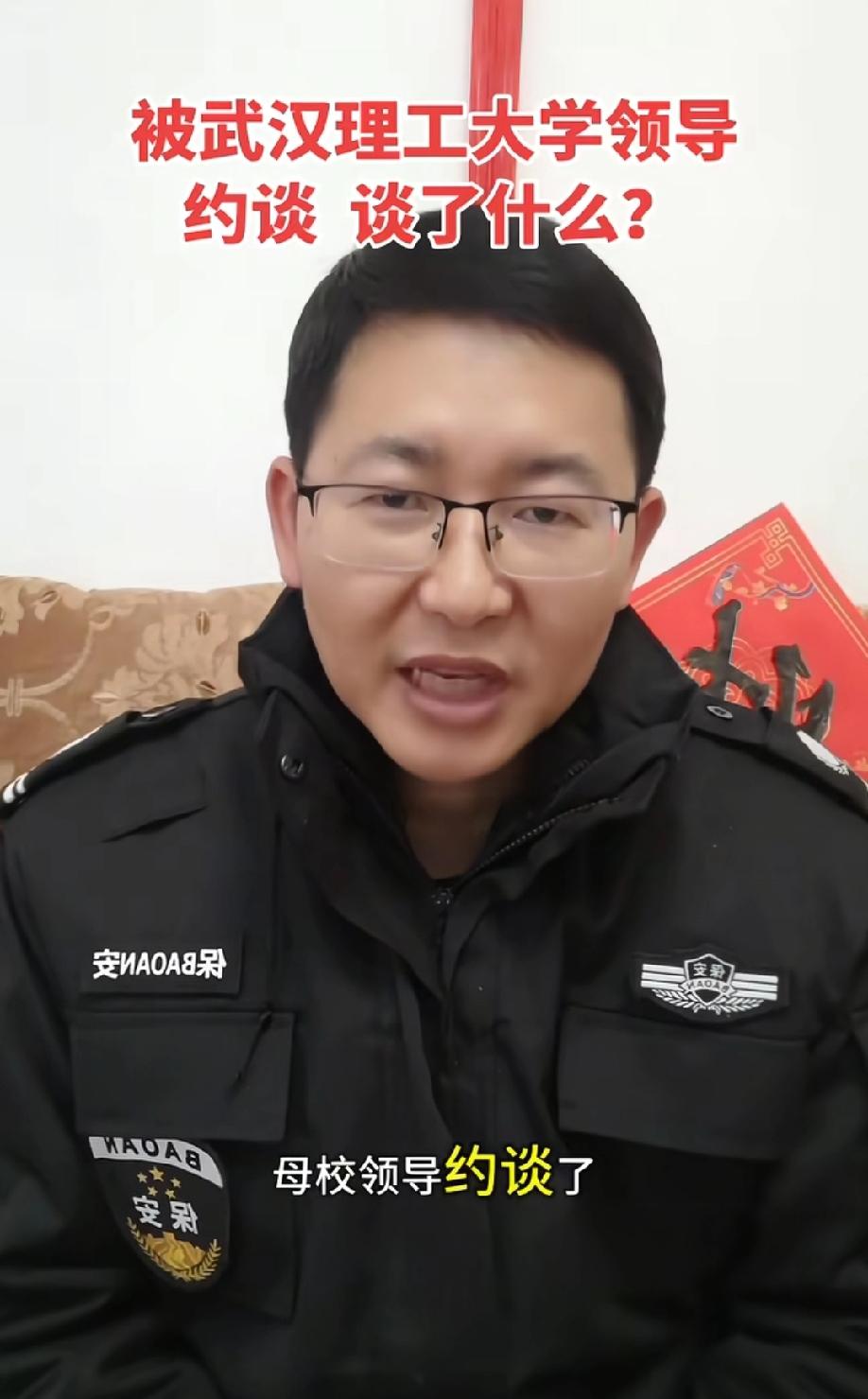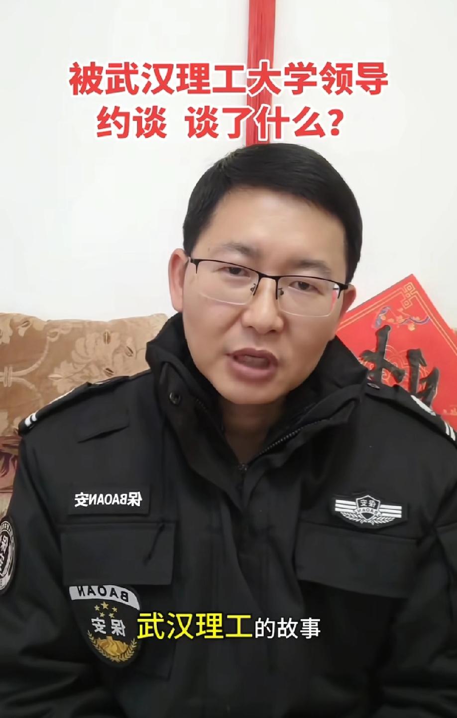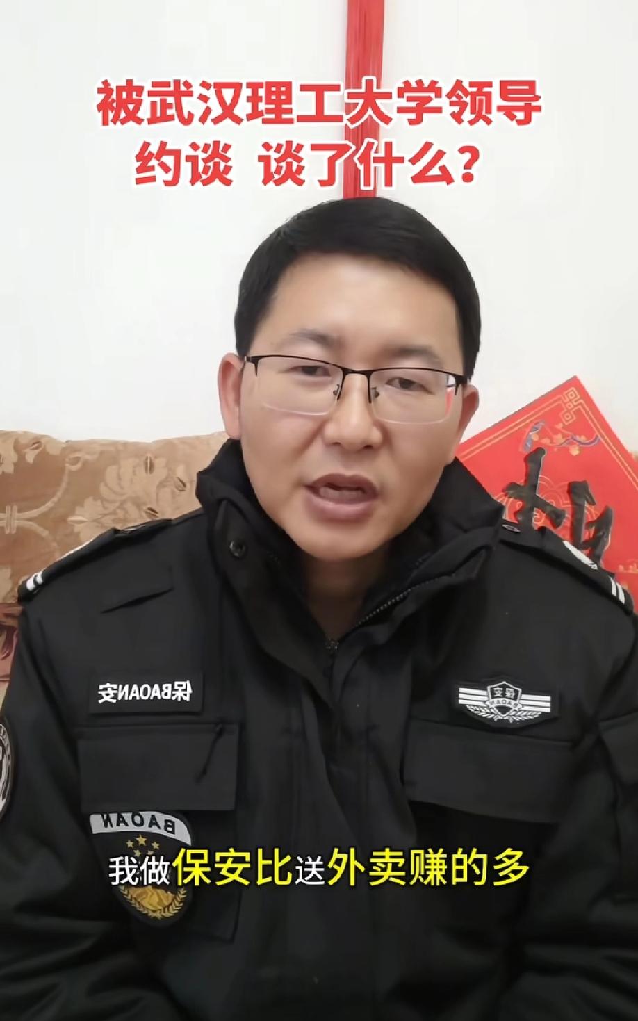 武汉理工毕业生当保安被母校约谈。当事人发视频回应:学校工作人员希望我继续讲好武汉理工大学的故事,但一定要是真实正能量,不要产生负面的影响…… 当事人视频最后还表示:自己现在做保安的收入比送外卖赚的多。 网友吐槽:N年前,记得好像还是北大或者清华的毕业生,还出来卖猪肉的呢?武汉理工大学总不至于比清北还牛逼吧,人家学校就不会约谈毕业生。如果真的关心这位兄弟,就把他收编入学校保安处。 评论区诸君,你们怎么看这个事情?