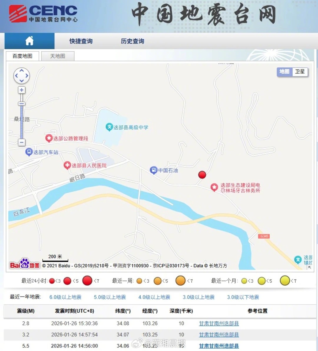 【#甘肃地震亲历者称有看到墙体倒塌#,#迭部县应急局称用电用水用气正常#】中国地震台网正式测定:1月26日14时56分在甘肃甘南州迭部县(北纬34.06度,东经103.25度)发生5.5级地震,震源深度10千米。#甘肃地震# 中国地震台网显示,震中心位于迭部县城迭部汽车站东侧附近。1月26日下午,震中附近一商户告诉潇湘晨报·晨视频记者,她今天在附近做事,看见周边房子有的尚好,有的则墙体倒塌了,她家里人没受伤,附近暂未看到有伤亡情况。也看到有消防等救援车辆路过。随后,迭部县应急管理局工作人员回应记者:目前未收到人员伤亡报告,正组织群众转移到安全地带,房屋有出现开裂现象,未出现道路阻断情况。当地用电、用水、用气正常。潇湘晨报记者於广强 甘肃