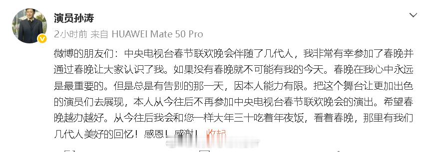 孙涛称不再参加春晚演出 演员孙涛发文称之后不会再参加春晚:“如果没有春晚就不可能有我的今天。春晚在我心中永远是最重要的。但是总是有告别的那一天,因本人能力有限。把这个舞台让更加出色的演员们去展现,本人从今往后不再参加中央电视台春节联欢晚会的演出。希望春晚越办越好。” 演员孙涛宣布告别春晚