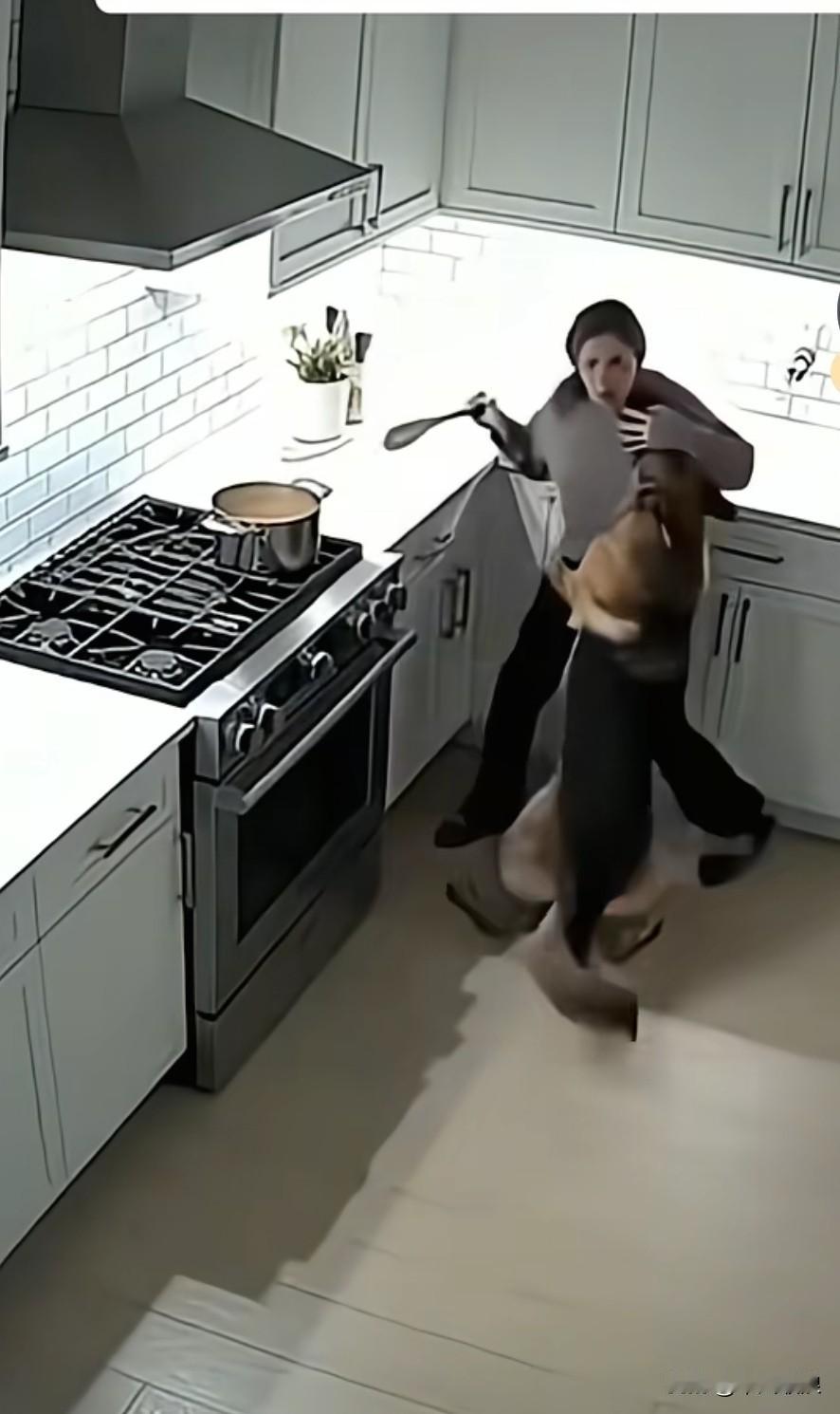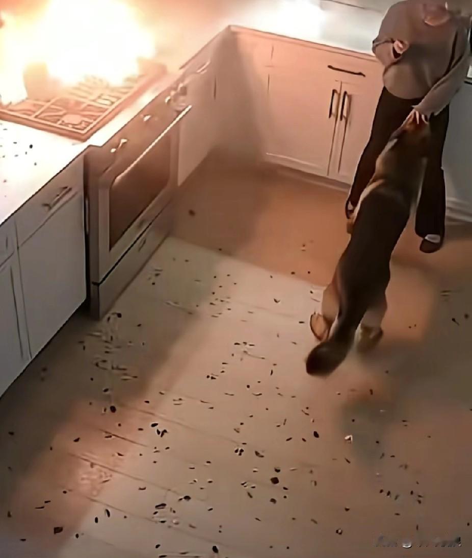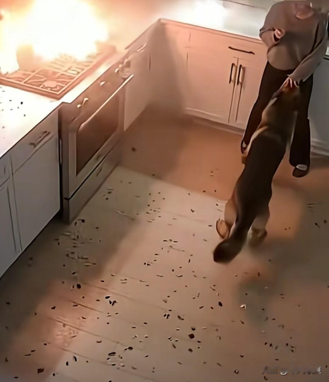女主人开启液化气灶,正打算炒菜,狗狗嗅觉极为敏锐,赶忙推开主人。紧接着一声巨响,
