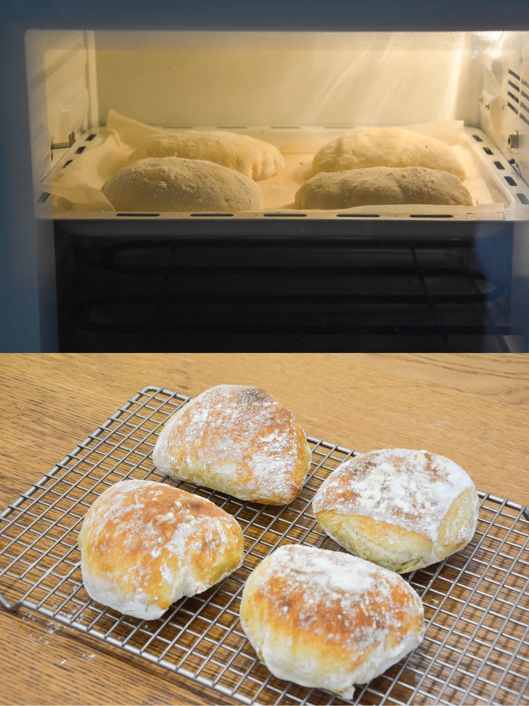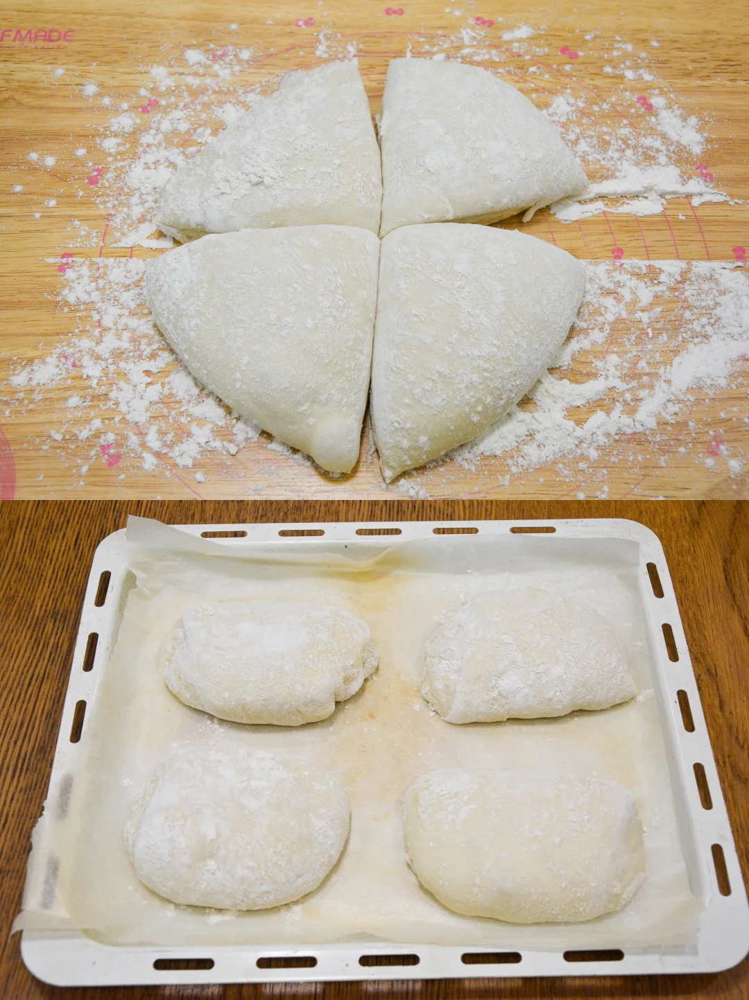 4. 面团2倍大,表面及案板上撒多多的T65;分割4等份,用刮板略整形,入烤盘,静置15分钟;