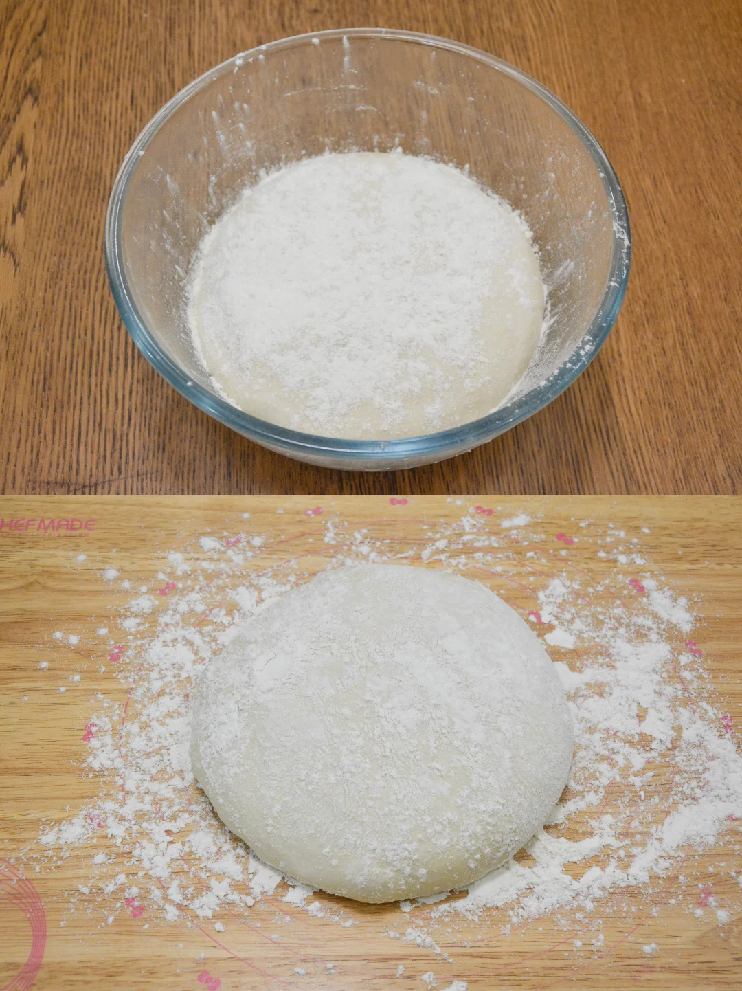 1. 面粉、清水、干酵母、盐混合成团,淋橄榄油;放冰箱冷藏30分钟;