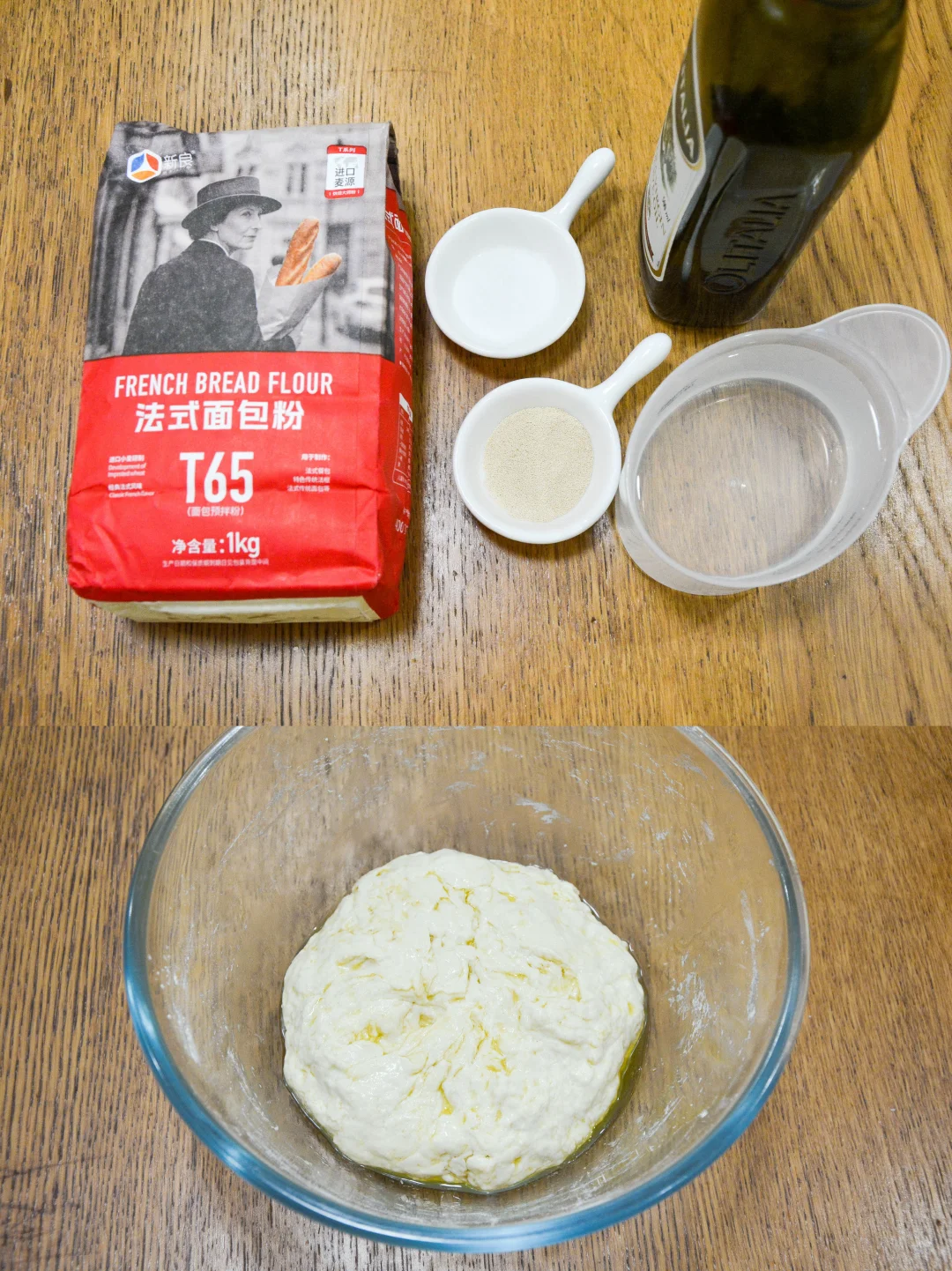 【材料】新良T65 300克,清水270克,干酵母3克,盐3克,橄榄油10克