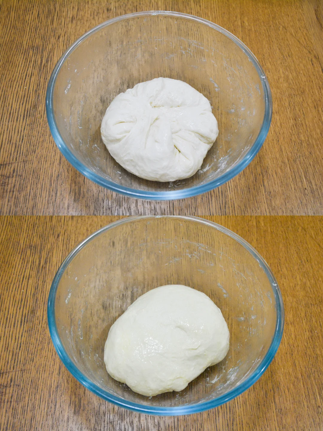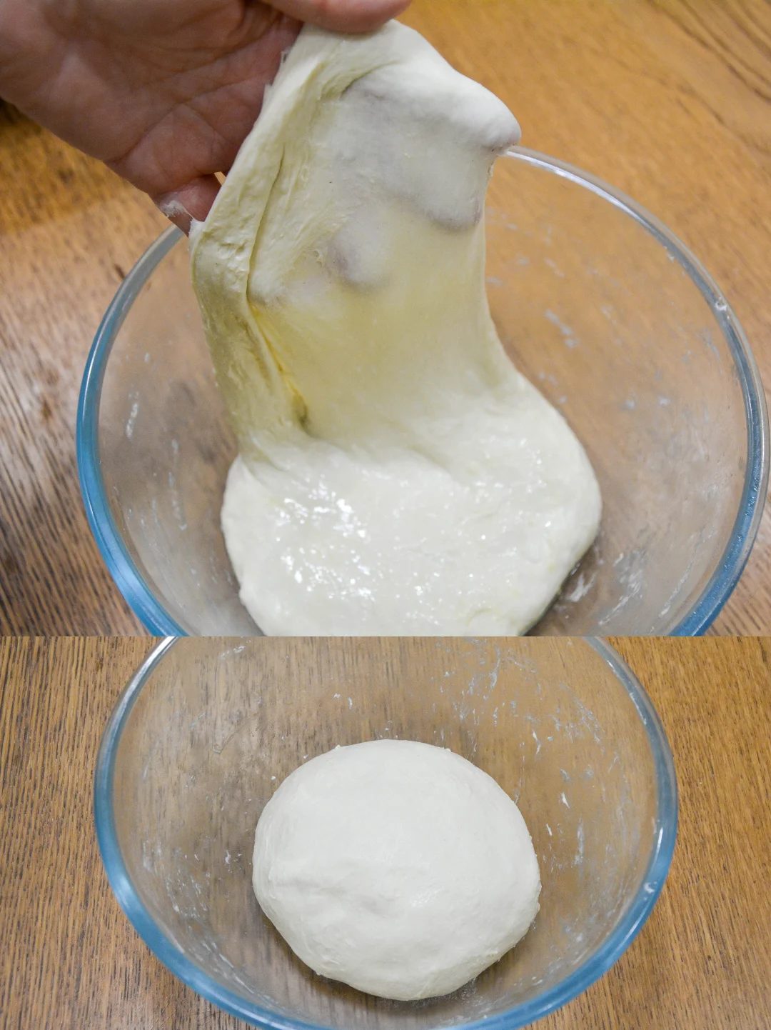 3. 第二次折叠前检查面筋,薄且非常有韧性;折叠后室温发酵1.5-2小时;