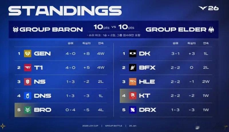HLE或将小组垫底无缘入围赛?目前大龙组和远古龙组总比分10比10,意味着超级周赢下3场及以上的一边将会成为胜者组,而败者组的最后一名则将直接被淘汰出局。如果下周DRX赢下BRO,且HLE不敌GEN,两队的战绩都会来到2-3,根据小场成绩决定远古龙组最后一名的归属(若KT不敌NS,同样需要比较小场成绩)。此时如果T1vsDK、NSvsKT、DNSvsBFX这3场比赛中,大龙组(即左边)赢下其中的2场,远古龙组的最后一名(有可能是HLE)将无缘入围赛,同时结束第一赛段的征程。2026lck 英雄联盟S16 英雄联盟