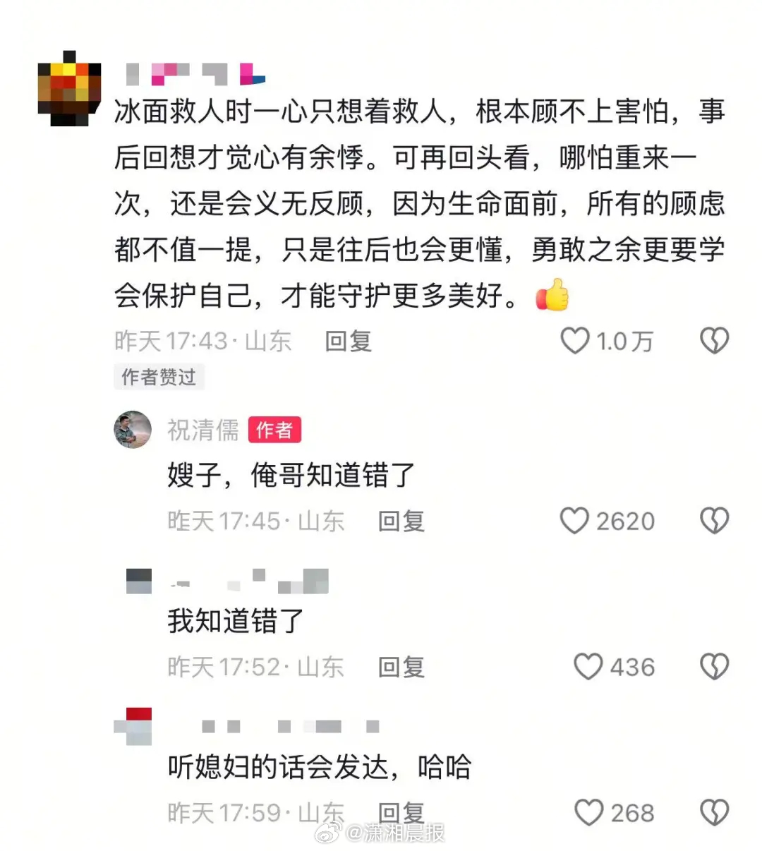 【#不会游泳男子冰面救人妻子留言叮嘱#,男子调皮回复:知道错了!】1月25日,山东菏泽网友发布一则惊心动魄的救援视频。视频显示,天已漆黑,有两人不慎从结冰的河面落水,即将失去意识。一名黑衣男子迅速行动,在冰面上匍匐前进,用力将救生用品传递给落水人员。随后消防员赶到合力把人救上岸。视频下方配文:“事后回想,说实话只要是个人肯定都会怕,我们就是普通人,怎么忍心眼看着他在你面前丢掉生命,不是无所不能,而是竭尽全力。”令网友忍俊不禁的是,事后当事人的妻子在视频评论区“批评”他:“勇敢之余要学会自我保护。”救人男子则俏皮回复:“嫂子,俺哥知道错了!”26日下午,潇湘晨报记者联系上视频发布者祝清儒,他是当地汪汪公益救援队的队员,也是视频中率先冲下去救人的黑衣男子。祝先生告诉记者,当时是1月24日凌晨,气温零下几度,河面结了冰但并不结实。一名小伙因压力大情绪激动跑向河中,朋友阻拦他未果,结果二人一起掉进水里。他看到的时候两人正在挣扎,“给我急得够呛,正好车里有几个救援工具“落水保”,但是太远了扔不过去,我就爬过去拿给他。当时其中一个人已经失去意识,飘起来了,他同伴用救生圈把他架起来,随后消防员赶到,才合力用绳索拖回岸边。”随后医护人员进行简单急救,送往医院,“他们现在身体应该没啥事,在医院恢复中。”回忆起当时的场景,祝清儒现在还有些后怕,“下去的时候脑子一片空白,光想着救人,结果爬到跟前发现冰特别薄,啪啪作响,这时候就有点害怕了,因为我也不会游泳。手里两个救生用品都已经给了落水者,我自己一点防护措施都没有,等上岸以后才发现已经不会走路了,腿是吓软的。”救援行动引发大量网友点赞。记者注意到,评论区有一条这样的留言:“冰面救人时一心只想着救人,根本顾不上害怕,事后回想才觉心有余悸。可再回头看,哪怕重来一次,还是会义无反顾,因为生命面前,所有的顾虑都不值一提,只是往后也会更懂,勇敢之余更要学会保护自己,才能守护更多美好。”下面有人回复到:“嫂子,俺哥知道错了”、“媳妇说得对”、“听媳妇的话会发达”等等。原来,这条留言是祝清儒的妻子写的,意在提醒他:救人的同时也要注意自己的安全。而祝清儒回复称“嫂子”是在玩梗。“对于我救援,妻子一直挺支持的。当天他们说‘回家之后,你老婆一定凶你’,结果没有,她只是煮了碗姜茶让我喝。”因为妻子知道,再遇到这样的情况,祝清儒还是会义无反顾地下去,她只叮嘱“以后得做好保护措施再行动”。网友纷纷留言:“义无反顾趴在冰面救人的瞬间让人泪流满面”、“如果我遇到这种情况也会下水救人”、“救援的时候请一定保护好自己!”潇湘晨报·晨视频记者徐茜宇 菏泽