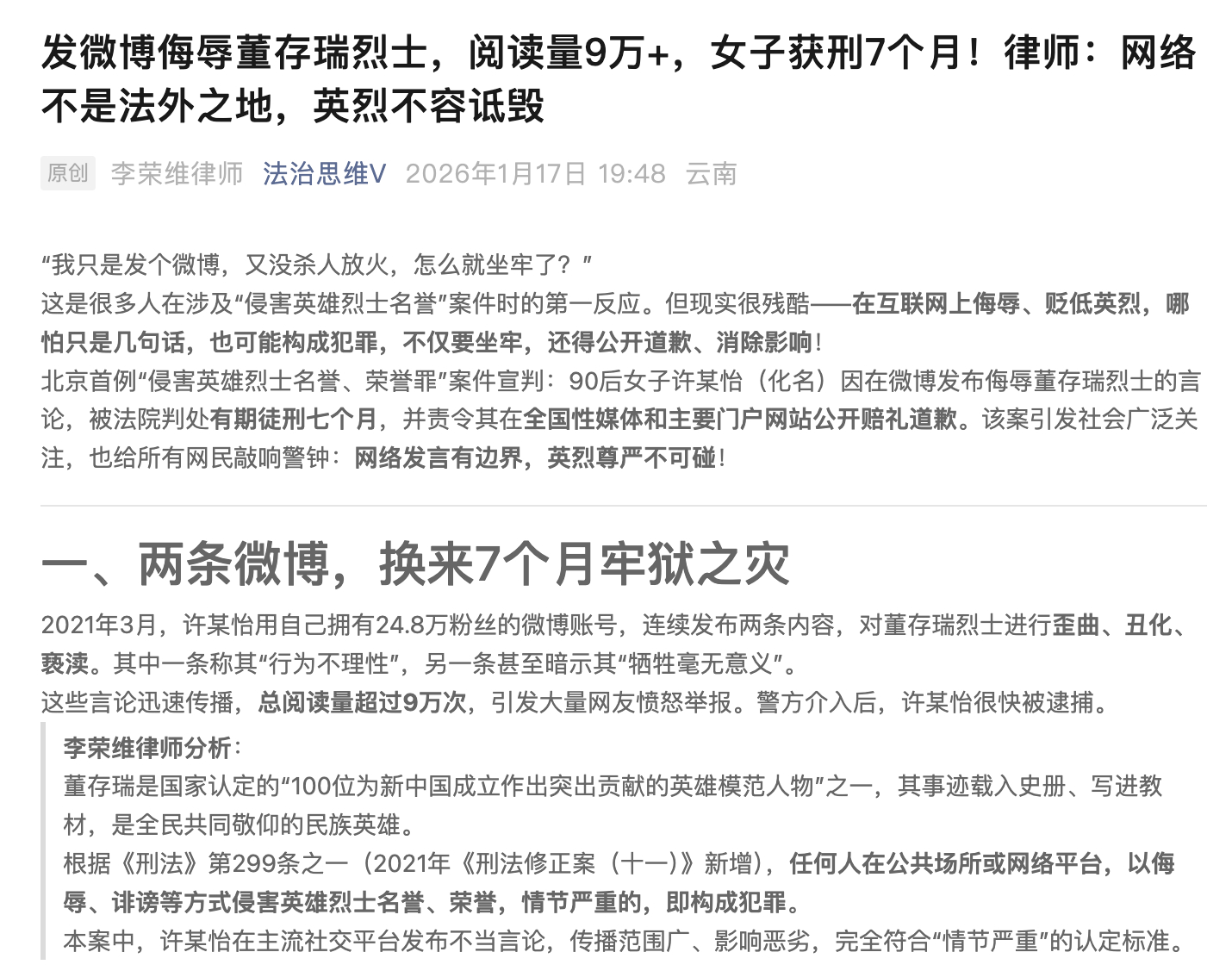 发微博侮辱董存瑞烈士女子获刑7个月这事儿好像网上没什么动静的?