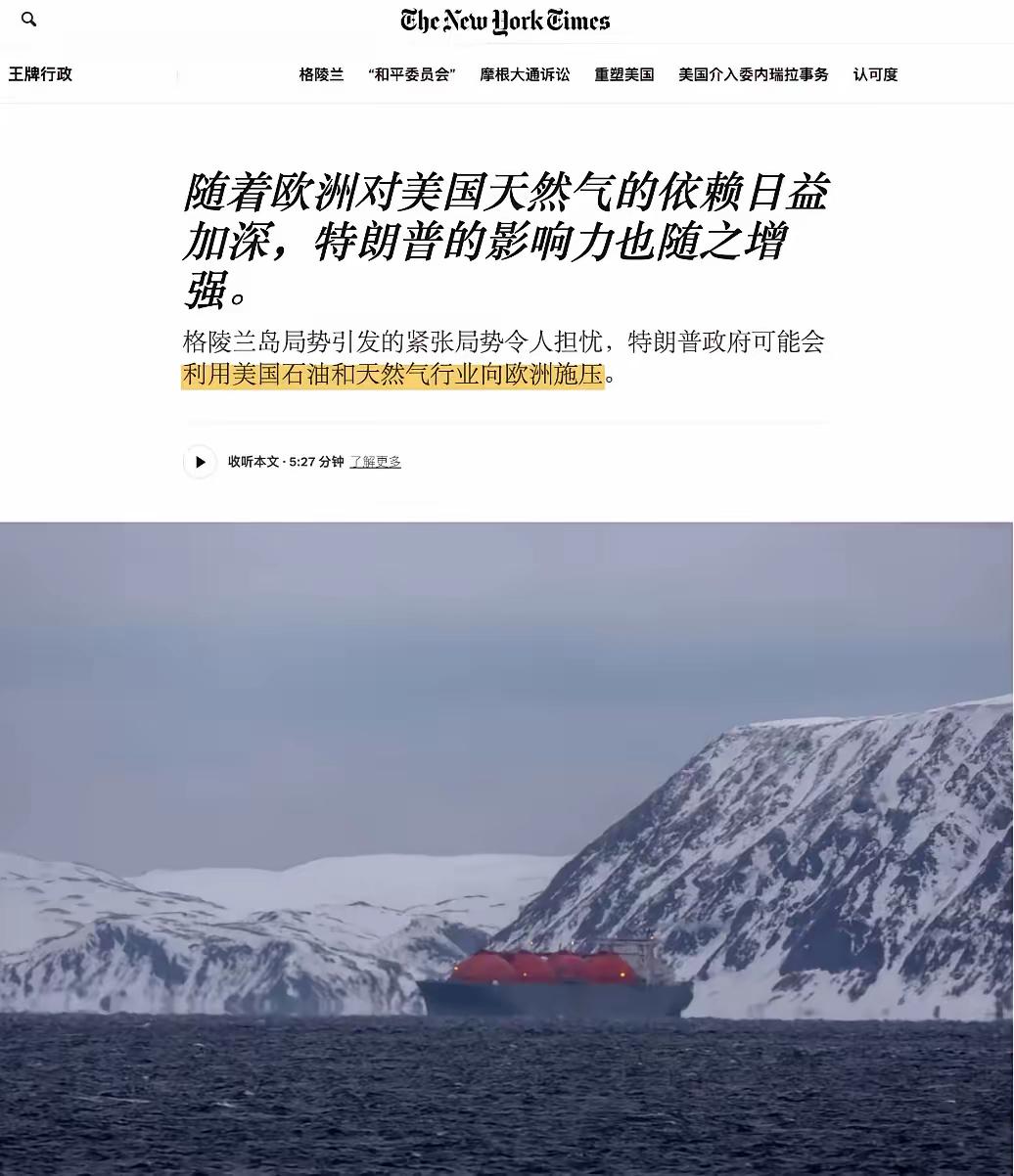 欧洲搬起的石头终于砸中自己的脚。 现在,欧洲将不得不面对来自美国的天然气威胁。用《纽约时报》的话来说,欧洲“只是用另一种巨大的依赖取代了之前的依赖”、“现在欧洲更容易受到以美国为中心的经济冲击”、“欧洲日益担忧的是,特朗普可能会利用美国在石油和天然气行业获得的强势地位,将其作为胁迫其他国家的武器。” 换言之,欧盟取消对俄罗斯的能源依赖,终于变成向懂王下跪的理由;欧盟鼓吹俄罗斯的入侵威胁,终于变成对美国入侵格陵兰的威胁——恐怕还不止。 有网友评论:总有一种很荒诞的感觉,就像龟兔赛跑一样,明明之前我们落后了太多太多,但是我们一直稳步前进,不敢懈怠。 突然有一天,我自己感觉也就最近两三年,我突然意识到,我们真的领先了这只兔子好多好多 这个被虐待狂就喜欢砸自己的脚,那又怎么办呢? 对此,你怎么看?