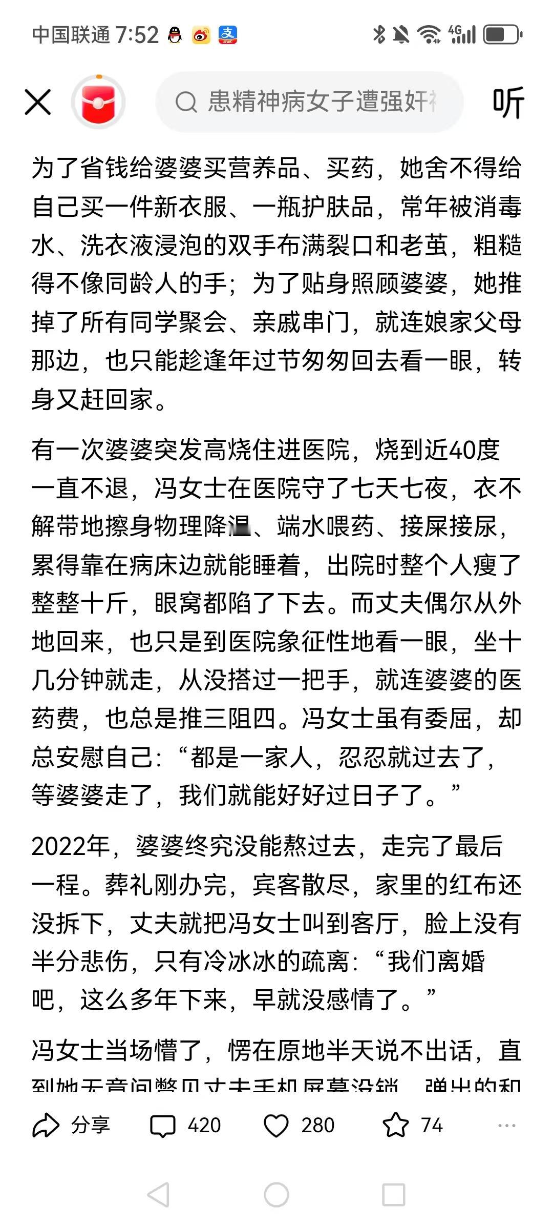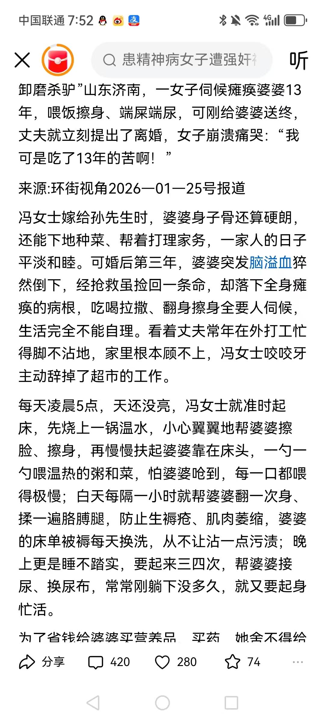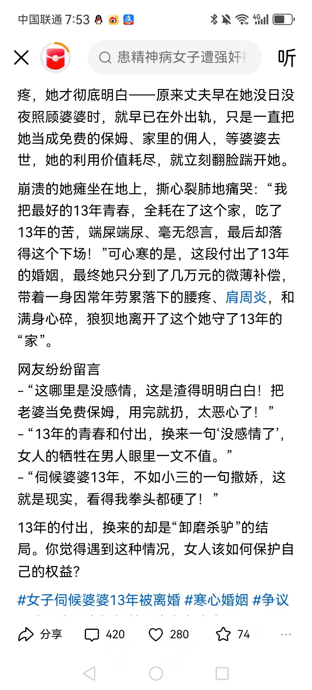 一女子伺候瘫痪婆婆13年,喂饭擦身、端屎端尿,可刚给婆婆送终,丈夫就立刻提出了离婚。离婚可以,儿媳没义务照顾婆婆,13年的护工费付清,再分家产,离婚。 离婚可以,必须付清13年保姆费用,否则想其他办法让他付出代价。 人在做,天在看,你老公,他会有报应的,你孝顺老人,老天会眷顾你的,你会幸福的。 女人一身病了,往后还有什么可以幸福可言,太傻了,人家的父母你帮人家伺候。 不用怕,离婚就行了。上天会惩罚这个男人的,也会赐福给这个女人的。祸福无门,惟人自召。善恶之报,如影随形。 会有更好的人在等着你,你会活的开心幸福。你前夫会后悔,离开你是你前夫最大的损失。 照顾婆婆应该让丈夫照顾,女人辅助就可以了,自己妈妈自己照顾。所以啊,婚内出轨入刑,可以减少很多这样的破事!