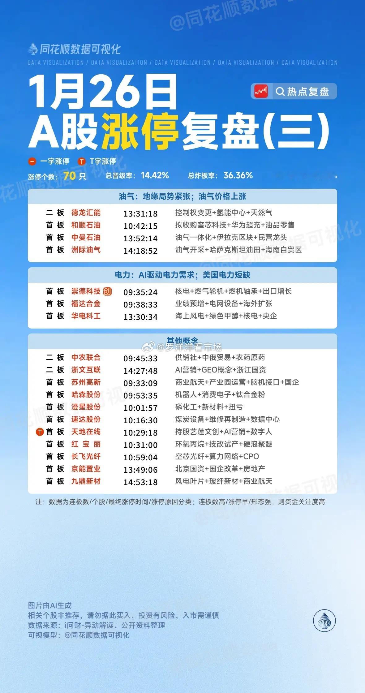 1月26日复盘:白银有色、东方日升、浙文互联、拓日新能、红宝丽隔日走势的一些看法!1、白银有色(贵金属)白银价格持续新高,早盘期货仍然是大涨,所以有色在高开后继续向上进攻,但是它整体毕竟在高位,再加上业绩确实难看,所以今天高位分歧非常大,但是架不住白银期货持续大涨,它最终还是顶住分歧走出了强势5连板形态!盘后的龙虎榜量化大幅卖出,接力的资金并不强,榜单整体净流出近7亿,毫无疑问有色今天的涨停更多的是市场合力的结果,而且整个贵金属情绪非常好,有色情绪涨停也就不难理解了,但是这个方向太依赖期货的强度,期货在连续大涨后还能不能持续很难说,所以说今晚的夜盘期货是重点,一旦继续强势,有色就可能持续表现下去,一旦出现明显回落,那么整个贵金属的炒作也会明显降温!2、东方日升(太空光伏)日升竞价大幅高开后在早盘迅速出现承接去封板,但是随着太空光伏的强分歧,它也出现了明显的砸盘兑现,之后就没有资金去承接回封了,最终走出了一个高位炸板的走势!盘后的龙虎榜两个机构是做T引导,徐晓、低位挖掘买入也超过1个亿,卖盘一个量化卖出2.2亿,中信建投酒仙桥路这个席位卖出1.3亿,是明显的潜伏盘,3日榜中曲江池、紫阳东路很明显也是引导做T,这样的榜单是非常不错的,游资整体锁仓状态比较多,机构持续做T引导,再加上太空光伏今天虽然有分歧,但是相比于商业航天的负反馈要要好很多,隔日一旦出现修复,日升出现趋势冲高概率还是比较大的,而且太空光伏这个方向的走势和之前的电网设备非常类似,一旦板块回暖,这些前排个股继续走出正反馈的概率是非常大的!3、浙文互联(AI应用)浙文竞价超预期开出一字板,但是开盘整个AI应用方向是强分歧,很快出现资金砸盘兑现,浙文虽然整体承接非常强,但是多次炸板后并没有资金强封了,直到午后在AI方向情绪回暖时才有资金回封,最终走出了一个高位放量连板形态!盘后的龙虎榜买盘成都系加仓8千万,新入场还有东莞武汉和量化,卖盘作手新一止盈离场,稼先路卖出大部分筹码,这是典型的资金接力换手榜单,而且从它午后封板力度看还是非常强的,再加上它今天高位筹码置换比较充分,隔日竞价一旦出现明显弱转强,还是非常有看点的,而且毫无疑问浙文是AI方向近期最强势的个股,一旦板块出现修复,它也是最可能加速的,而且它的新高表现是比较能够吸引资金去做二波行情的!4、拓日新能(太空光伏)拓日是今天太空光伏唯一最终走出一字板的个股,这说明资金做多的情绪非常强,而随着钧达的断板,它毫无疑问成了太空光伏方向的情绪龙一!盘后的龙虎榜是3日榜,成都系买入1.5亿,其余几个席位都是2千万左右买入,卖盘几乎没有抛压,这个榜单确实太一致了,从今天它的表现看,资金做多意愿是非常强烈的,拓日的表现有点类似电网设备的汉缆,一旦隔日继续强势一字板,对于太空光伏的修复会起到很大的促进,但是它毕竟连续缩量,而且隔日面临新高,如果板块开盘不是特别强势的话,它或许会出现很大的抛盘,开盘能不能顶住分歧会是一个非常大的看点,毕竟它前面不久就是连续两个缩量涨停后出现近天地板的兑现形态!5、红宝丽(化工)红宝丽竞价出现明显高开,再加上今天早盘商业航天、光伏都出现分歧下杀,化工方向反而出现一定板块效应,红宝丽在高位放出一定量能后有资金去强势封板,而且封单非常强势,最终稳稳的封死涨停到尾盘!红宝丽这个涨停是典型的N型上攻形态首板,而且整体趋势非常好,再加上它辨识度非常高,所以虽然化工方向整体板块效应不是很明显,红宝丽依然能够独立走出强势表现,而且这只个股流通市值并不高,是很适合资金持续接力的,所以它虽然没有特别强的板块效应,但是它可以走出类似山子的表现,而且相比于山子,它的优势更为明显,而且它整体位置并不高,接下来只要有资金持续引导,它走出超强表现还是比较值得期待的,但是这只个股毕竟是缩量涨停,隔日不开一字板的话抛压会很大,所以开盘一旦大幅高开,出现明显资金砸盘的话就要注意兑现的风险,但是如果板块出现明显共振,红宝丽之后的趋势还是比较值得期待的!