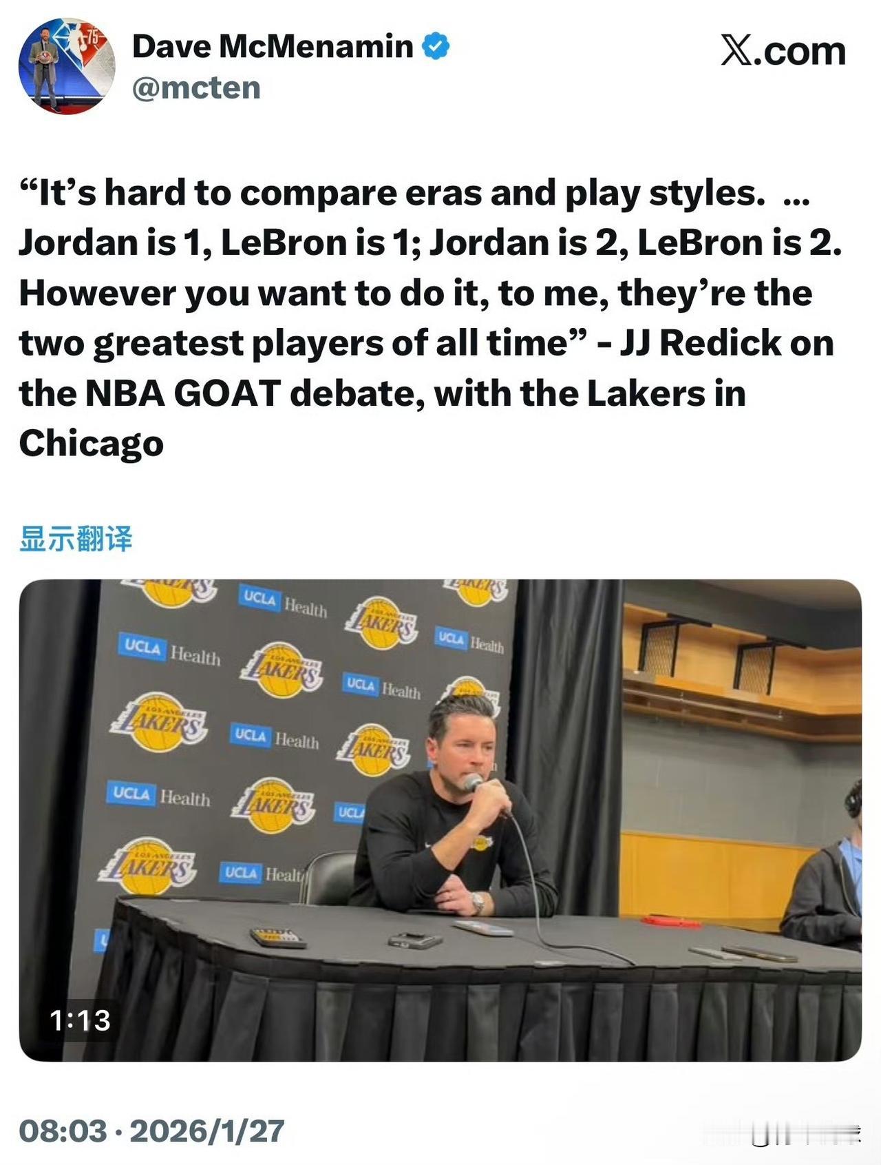 雷迪克说了句公道话啊! 今天,湖人队要做客芝加哥挑战公牛队。由于詹姆斯在队内,主教练雷迪克不可避免的被现场记者问到了谁是GOAT(历史最佳)的问题,他的回答尽显高情商:“不同时代、不同打法很难比较。如果乔丹是第一,那詹姆斯也是第一;乔丹是第二,那詹姆斯也是第二。在我看来,他们两个都是历史最佳。” 雷迪克说了句公道话啊,他并没有因为詹姆斯在自己队内就说他是历史最佳,而是把这两人都评为历史最佳,这样就会少了很多非议。乔丹和詹姆斯谁是历史最佳的话题一直争论不休,其他球员很难与这两人相提并论,这就足以证明他们都是历史最佳球员,雷迪克说得一点没错。如果真要分出个高低,还是等詹姆斯退役之后再做判断,毕竟他41岁还能场均22+6+7,还能创造更多的历史。