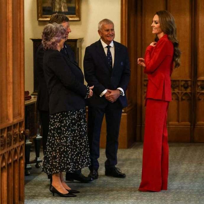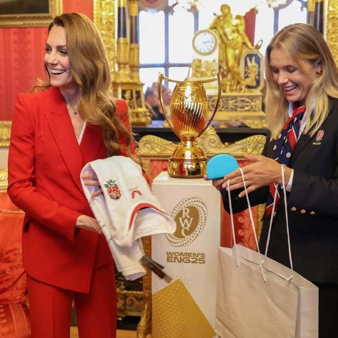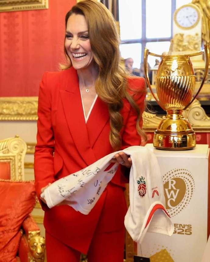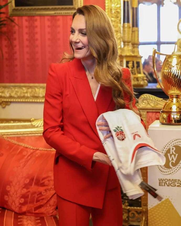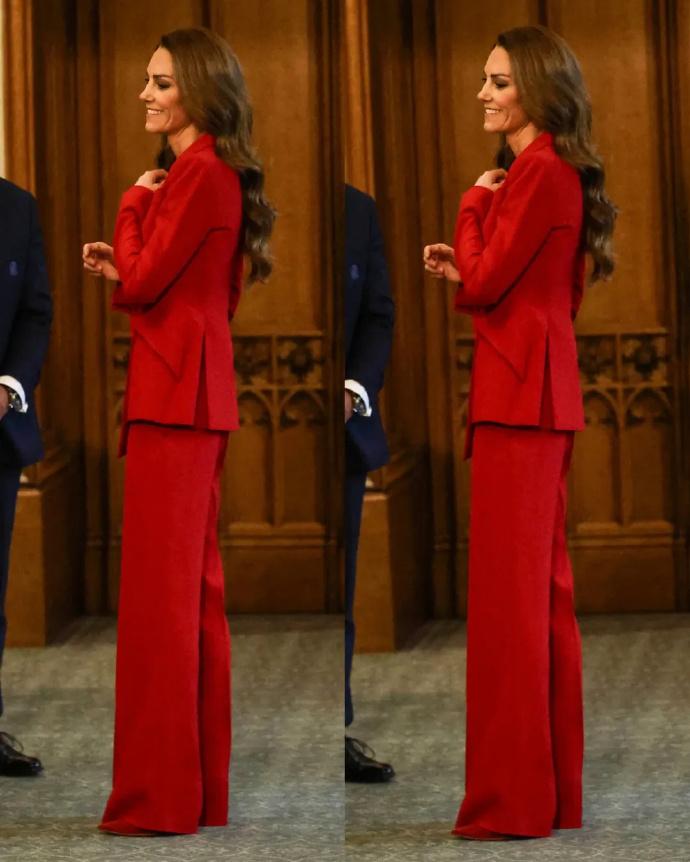 看到这样的凯特王妃,真是让人心疼! 这组照片是1月15日,凯特王妃作为橄榄球联盟皇家赞助人,在温莎城堡为夺得2025年女子橄榄球世界杯冠军的英格兰队举办欢庆招待会时所拍摄的一组照片。 照片里的凯特王妃穿上了一身正红色套装,这个颜色是威廉王子曾公开表示,最喜欢妻子凯特王妃穿着的颜色。 的确,穿着一身红色职业装,搭配大波浪卷发的凯特王妃,优雅又时尚,整个人光彩照人,很是迷人。 但是侧身而立,已经44岁的凯特王妃整个人瘦的就像纸片人,毫无一丝女性该有的婀娜曲线美。 但是瘦弱的她,依旧笑容灿烂,还是那么的阳光治愈有活力,那么的让人惊艳!