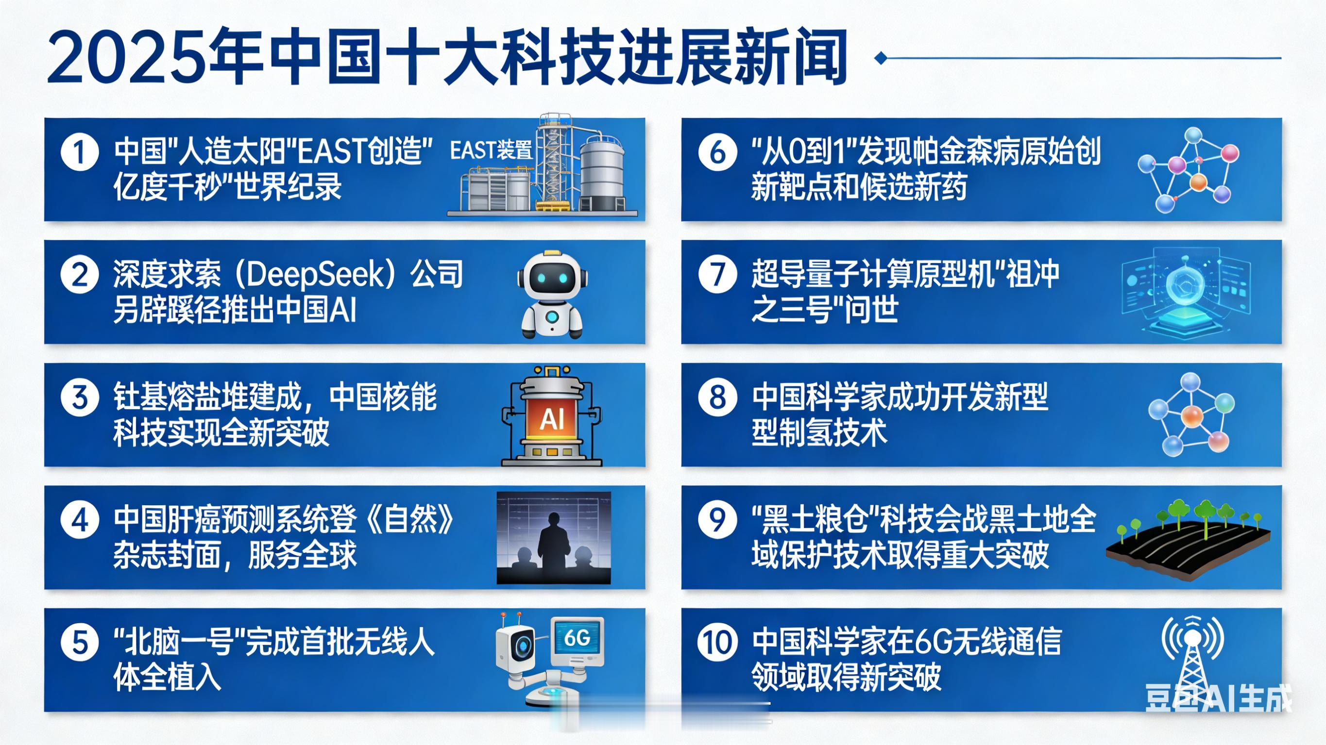 2025中国十大科技进展新闻两院院士评选的 2025 年中国十大科技进展新闻分别是:中国“人造太阳”EAST 创造“亿度千秒”世界纪录;深度求索(DeepSeek)公司另辟蹊径推出中国 AI;钍基熔盐堆建成,中国核能科技实现全新突破;中国肝癌预测系统登《自然》杂志封面,服务全球;“北脑一号”完成首批无线人体全植入;“从 0 到 1”发现帕金森病原始创新靶点和候选新药;超导量子计算原型机“祖冲之三号”问世;我国科学家成功开发新型制氢技术;“黑土粮仓”科技会战黑土地全域保护技术取得重大突破;我国科学家在 6G 无线通信领域取得新突破。