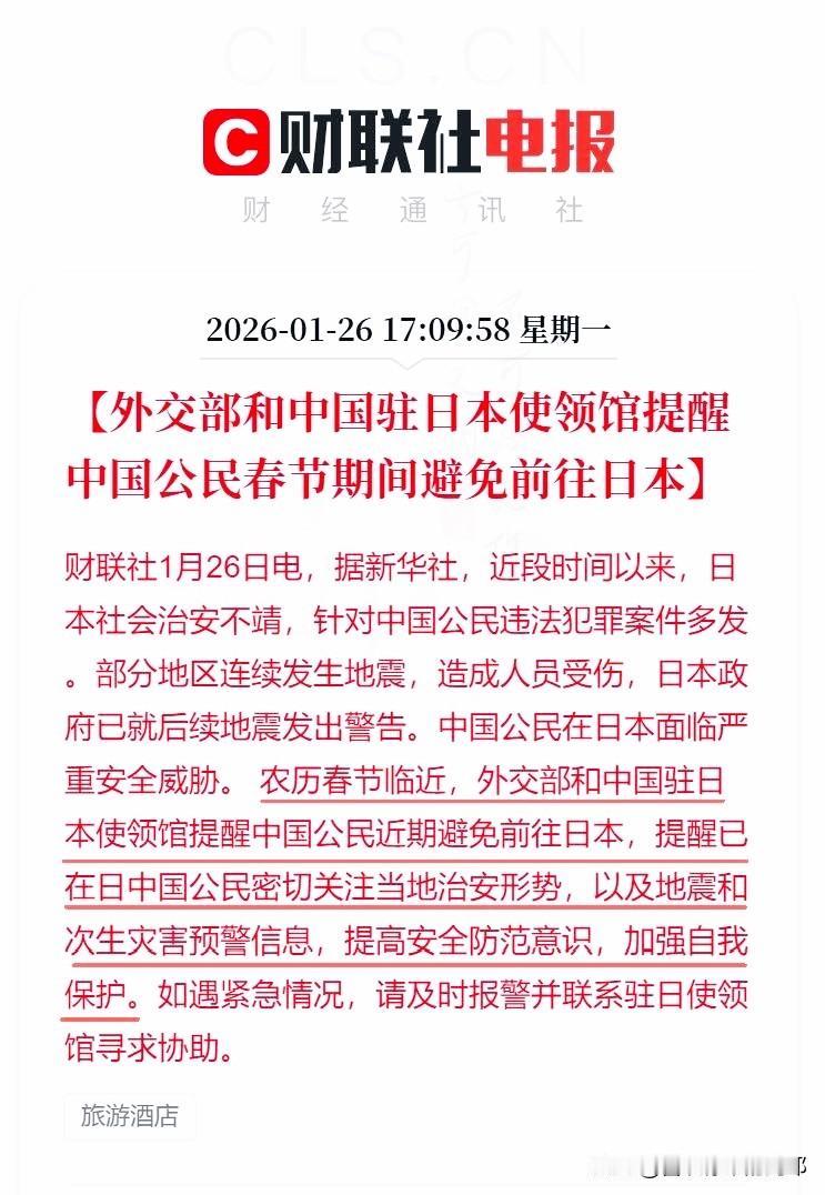 春节赴日游直接叫停! 外交部强硬提醒,这波真的别硬冲 春节计划去日本的宝子赶紧醒一醒!外交部刚发的紧急提醒别不当回事,直接建议春节期间别去日本,这可不是普通的温馨提示,是实打实的安全预警,当下的日本真的一点都不适合出行! 谁能想到原本的热门赴日游,现在成了双重风险叠加的高风险选项,光是2026年1月,驻日使领馆就接到了30多起中国公民的安全求助,全是涉及人身伤害、财物被盗的糟心事,针对国人的违法犯罪案件扎堆,出门逛个街都得提心吊胆。更别说青森、石川等地接连强震,日本政府还在持续发余震和海啸预警,6名中国游客刚在日本滑雪场被困近20小时才获救,这样的自然风险下,出门旅游根本就是拿安全赌运气。 而且现在想赴日也基本走不了,2月春节时段的49条中日航线直接全取消,1月的赴日航班取消率更是飙到了47.2%,就算你提前订好了机票酒店,要么走不了要么得扣高额手续费,各大旅行社的赴日订单退订率超60%,纯纯的花钱找罪受。更让人膈应的是,日本还敲定了2026财年排放6.24万吨核污染水的计划,海洋和环境的潜在风险还在持续增加,这趟旅行从根上就没了安全感。 我一直觉得,春节出游的核心从来不是打卡某个目的地,而是平安开心,花着钱冒着人身和健康的双重风险,完全违背了出行的初衷。外交部的每一次海外安全提醒,都是基于实际风险的精准预判,是给国人的安全保护伞,真没必要为了一趟旅行,把自己置于各种不确定的风险中。 如果已经身在日本,一定要多注意,减少不必要的外出,别去偏僻区域和人流密集的地方,牢牢记住日本110、119报警急救电话,还有国内的12308领保热线,遇到任何问题第一时间求助,保护好自己才是第一位的。 其实现在出境游的选择多到挑花眼,中巴双向免签能直奔南美体验别样风情,东南亚一众目的地也能说走就走,性价比和安全性都拉满,何苦盯着日本这个高风险选项死磕。春节本就是团圆开心的日子,千万别让一次冲动的出行,毁了整个假期的心情。 你原本有春节赴日的出行计划吗?会果断调整行程选择其他更安全的目的地吗?评论区聊聊你的春节出行安排~
