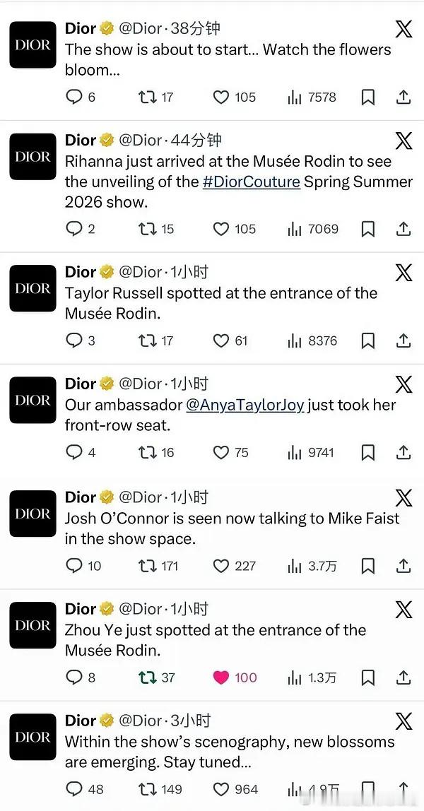 周也Dior此次高定秀全球首位转发周也Dior高定秀全球首位转发DIOR大秀 周也以 DIOR 品牌大使身份现身 2026 春夏高定秀,拿下大秀全球首个转发名额!看 G 社的生图,这脸蛋儿是真的权威,太绝了