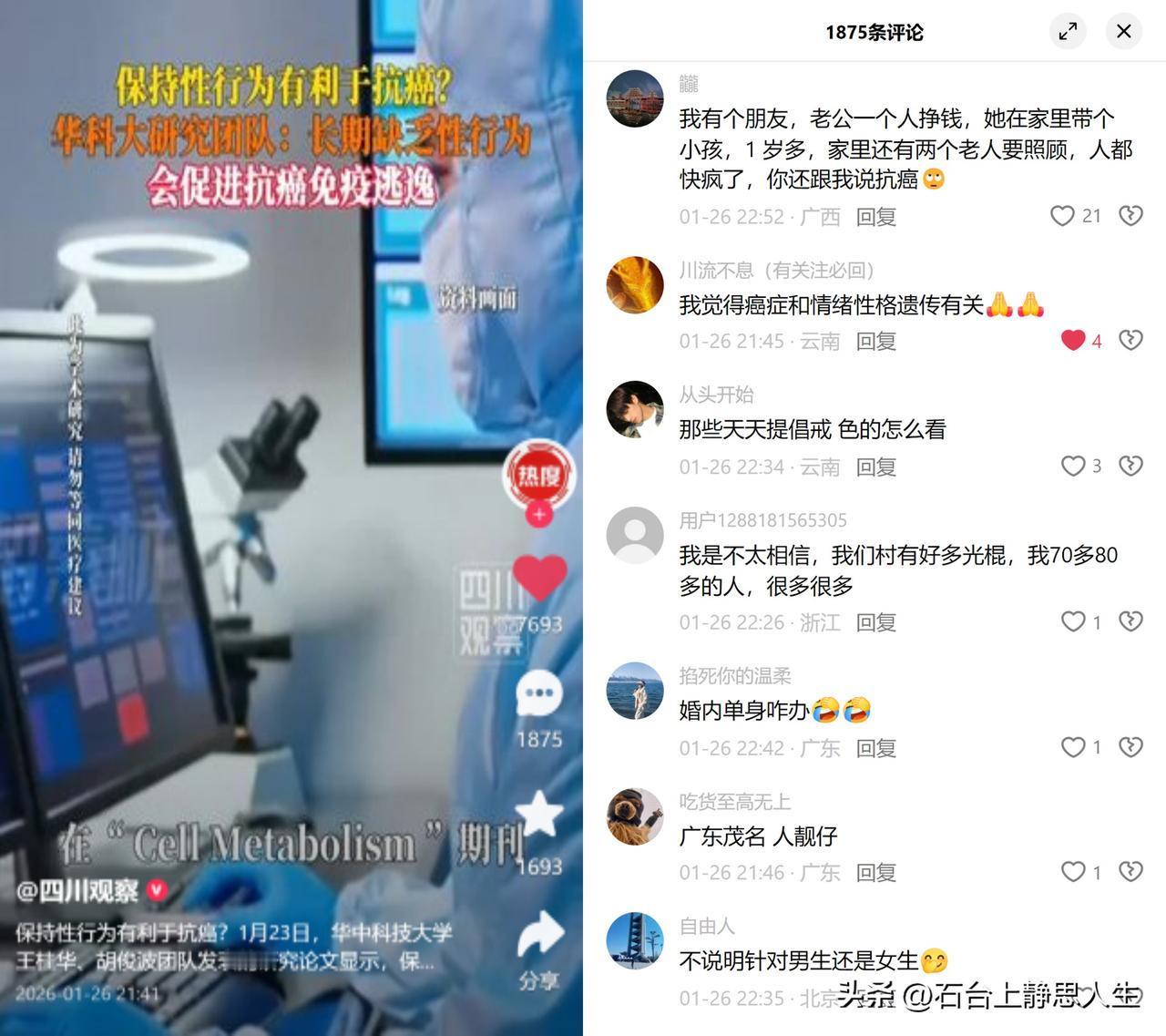 华中科大的抗癌研究火了,留言里却全是扎心吐槽。 研究说规律性行为有助抗癌,可大家的留言全是现实, 带娃加照顾老人的妈妈忙到发疯,单身十年的人连恋爱都顾不上,还有人拿村里长寿光棍反驳。 这其实是典型的幸存者偏差。 数据显示修女80岁后乳腺癌风险是普通人三倍,男性适度射精能降前列腺癌风险,个案代表不了整体。 但更让人唏嘘的是,这些抗癌良方对很多人来说就是奢侈品。 大家倒也不是不信研究,主要是得养家、还债、应付一地鸡毛的生活,连好好睡觉都成了奢望,哪来精力顾这些? 那些听起来正确的健康建议,背后藏着多少普通人触不到的生活有余力门槛?