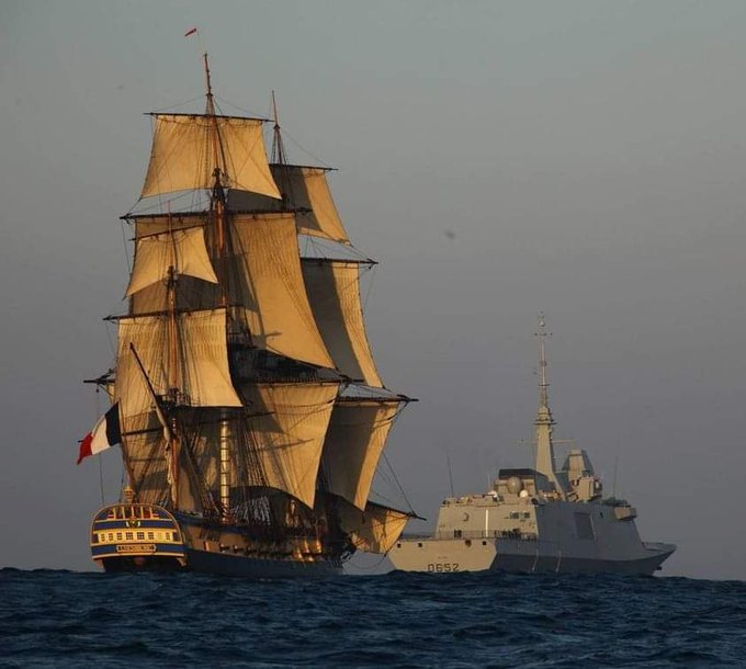 雄伟的三桅帆船“赫敏号”与现代化的阿基坦级FREMM护卫舰并肩航行,技术代差长达250年。