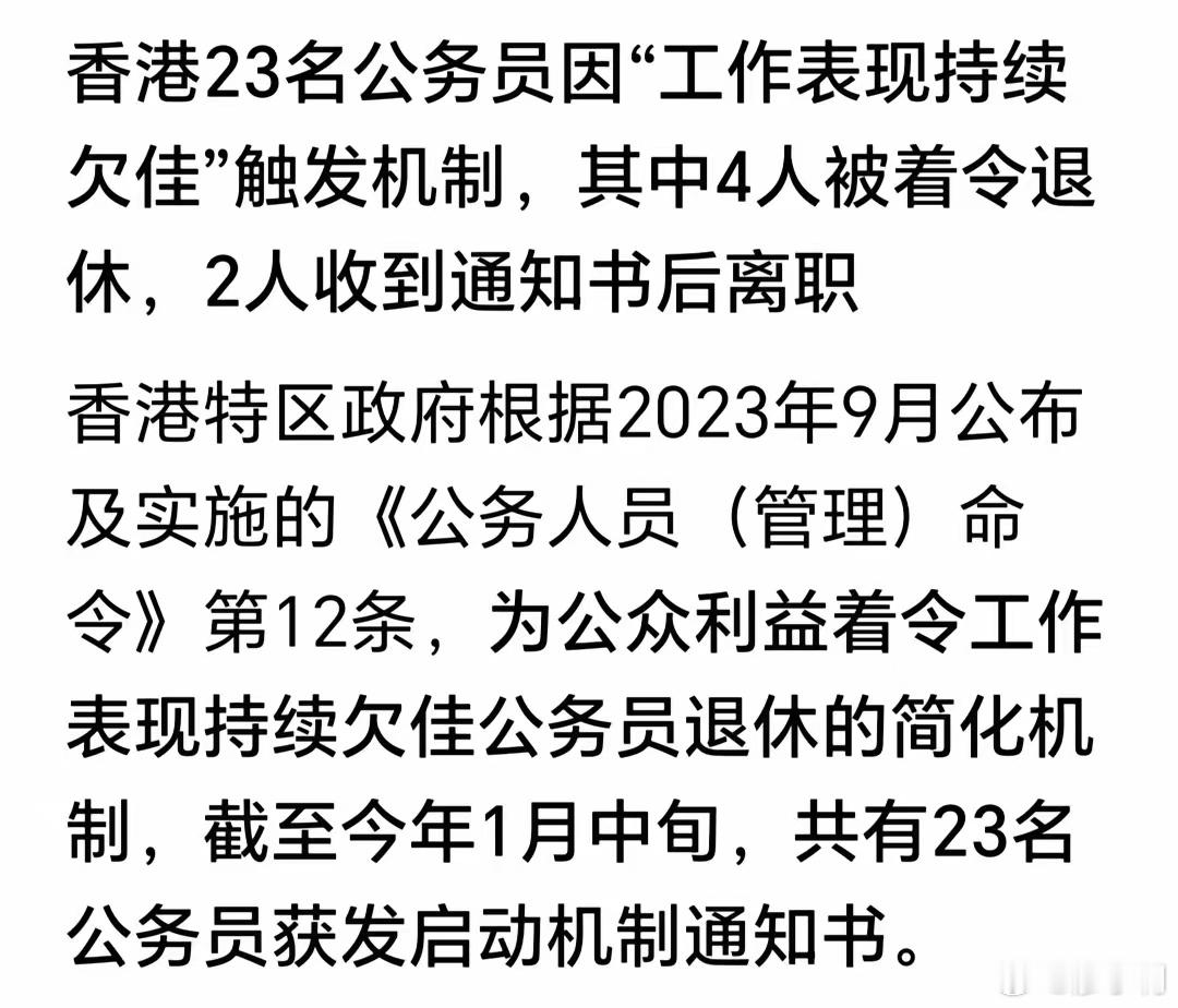 香港4名公务员表现欠佳被着令退休香港有23名公务员因工作表现持续欠佳,触发机制。其中四人被着令退休,两人收到通知书后离职。“着令退休”就是咱们通俗理解的“强制退休”。这才是真正的公务员“能上能下”机制,内地也该照搬实施,以惩治尸位素餐的体制内现象!热点观点