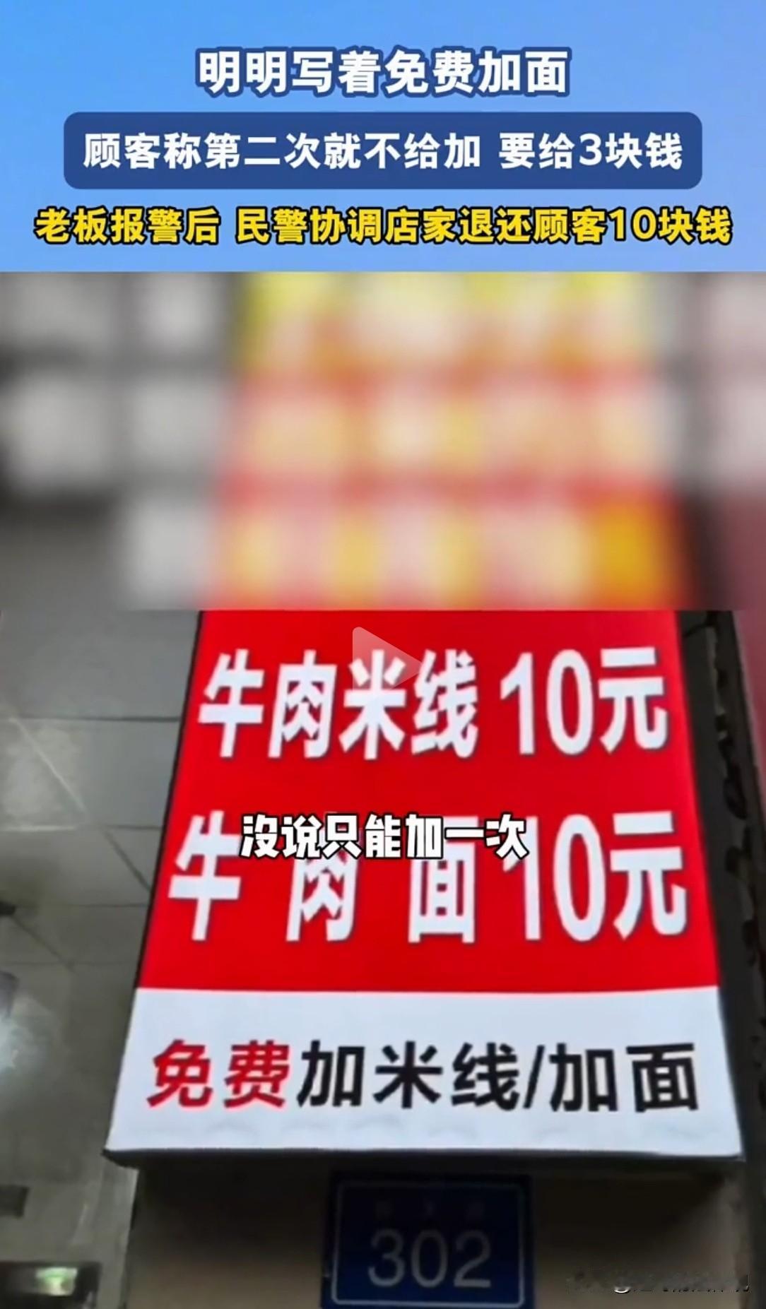 格局太小,还是占便宜?四川乐山,一男子来当地旅游,面馆招牌上写着免费加面,男子心里热乎乎的。点了一碗面不够吃,续了一次面仍没吃饱,再续第2次时,老板脸色难看,要求加3块钱。男子认为,店家不讲诚信,老板称,没写可以加第2次,双方发生争执,有老人骂骂咧咧,冲出来要动手。网友:这格局,面馆永远做不大! 辽宁的邢先生,最近来了一场说走就走的旅行。 他来到四川乐山,尽情浏览着当地的风土人情,却没成想,竟被一碗面给破坏好心情。 那天,邢先生玩的时间比较长,饥肠辘辘才想起到了饭点。 他一边溜达一边找饭馆,被一店家的招牌吸引了。 店家门口立着一块大牌子,上面写着:牛杂面10元、牛肉面10元,各种米线10元。 牌子的最底端写着:免费加面。 邢先生感叹,自己真是遇上良心老板了! 北方人一般都喜欢吃面,对米线不太感兴趣。 邢先生进入店内,就点了一碗牛肉面,交了10块钱。 面上来了,看上去很诱人,邢先生也是饿了,三下五除二一碗面就见了底,可他连半饱没到。 他就去续了一碗面,有了上一碗面的垫底,邢先生吃的没那么急了。 他边吃边观察着这家南方特色的面馆。 果然和自己家乡有着天壤之别,这里的人们说话软声细语,不像东北人的粗门大嗓。 在饮食上也大有不同,北方人食量大,在饭店吃饭,店家的饭菜,分量也大。 不知不觉中,邢先生第2碗面也吃完了,可他还没吃饱。 他以为,店里写了免费续面就是是管饱,他拿了碗再次去续面。 谁知一女子正盯着他,见他第2次续面,脸就拉长了。 女子说:“你这是第2次续面了,要加3块钱,你还加不加面?” 邢先生不乐意了:“你这不是写着免费加面吗,为啥收3块钱?” 邢先生还笑着说:“我就加最后一次了,以后多来咱家消费不就行了吗?” 店家女老板的脸色变得更很难看了,直接把邢先生的碗收走了。 这可不把邢先生气坏了,在他们那里,饭没吃饱被收走碗,这是对人的极不尊重。 他和老板争执起来,大声质问:“你家写的免费续面,又没说只能加一次,咋说话不算数?” 女老板也不让人:“我也没写要加两次的!” 邢先生认为,店家没写明白,自己是外地人,开始又不知道。 因为这和他们那边完全不一样。 旁边有个男的,用手机边录视频边说:“我这都录着呢,3块钱都不愿意出吗?” 邢先生称:“我不愿意出,你们一开始没说不能连续多加。” 这时旁边围满了人,有游客也有当地人。 有人说,人家面馆是小本生意,都像你这样,生意还怎么做? 邢先生还被一群人指责,心里不痛快。 他就是认为,店家写了免费续面又不让吃饱,这是忽悠顾客。 这时人群中有人说,邢先生吃白食,有个老头冲过来骂他,还要动手。 一群人在围观,众人纷纷指责他,说啥话的都有。 毕竟出门在外,邢先生怕出意外,拿出手机正要投诉时,店家报了警。 好在民警很快赶到现场,对双方调解。 民警说,让店家再给邢先生加一碗面。 可就现场的局面,邢先生肯定吃不下,于是在民警和当地人的劝说下,老板把10块钱退给邢先生面。 围观者仍在指责他吃白食,占店家便宜,面吃了还把钱拿走…… 邢先生不想争辩,拿着退回的面钱离开了。 当地市监局接到投诉后正在跟进,网信办工作人员指出,店家涉嫌误导消费者。 有人认为,免费续面,按正常人的思维就是只能加一次面。 即使店家没写明白,大家也心知肚明,不会再加第2次,毕竟店家是要赚钱的,10块钱一碗你非要吃撑,就是占便宜! 有人持反对意见,写了免费,顾客吃的多就得忍着,再说,免费加二次面的人很少。 交了钱吃面,哪来的白漂?玩不起别玩,度量小就别定这种规则! 一时间众说纷纭,评论区直接分为了两拨。 有人说,店家太小气,既然制定了规则就别耍赖。 有人说,邢先生就是贪心不足。 却有人站出来评判:这其实只是一个南北方差异问题。 南方人食量小,大部分人一碗面足以吃得饱,很少有人续面,就算有,加一次也足够了。 所以店家就以这样的标准制定规则。 而邢先生是东北人,食量大,一碗面刚垫底,吃两三碗面属正常。 在他们哪里,饭店上菜的餐具,很多都是直接用盆上菜。 这在南方,是闻所未闻的。 不信你们问问这几年去东北旅游的小土豆们,是怎样被投喂的? 这是诚信问题,而不是脸面问题。 你店家写的是免费续面,并没有写续面次数,只要不打包,能吃多少就加多少。 如果店家写了免费续面一次,给这个顾客多加钱,天经地义。 一家长称:他们哪里学校附近有一家米线店,承诺可以免费续碗。 小学生们吃不饱去续碗,每次都给脸色看,孩子们吃了两次就不去了,虽然附近就他一家,没多久就转让了 所以说,诚信最重要,这起纷争,没有对错输赢,只不过是南北差异而已。 你认为,是老板的格局小了?还是顾客想吃白食?