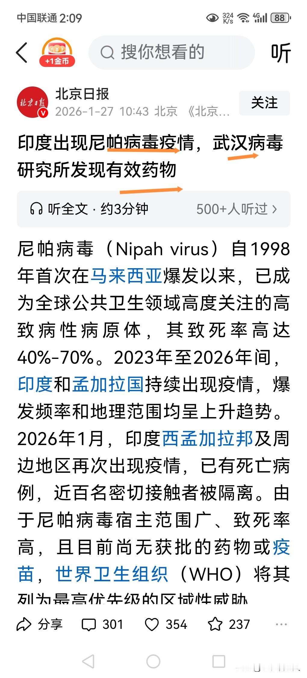 武汉病毒研究所发现对尼帕有效药物!厉害了 China! 2020年新冠病毒疫情爆发的时候,全世界还没有防止新冠病毒疫情的有效药和疫苗,我国的科学和医学工作者,通过了半年的努力,很快就研究制造出了防止新冠病毒的疫苗,以及治疗新冠病毒的中药制剂,用中医理论解决了新冠病毒感染者的世界难题,为新冠病毒临床治疗提供了宝贵的经验和有效的方法,为世界新冠病毒疫情的防疫工作作出了杰出的贡献。 而今,近日来在印度西孟加拉邦暴发尼帕病毒疫情的临床治疗,全世界医学界的人们都是束手无策,毫无办法,无法应对该疫情,并且对该疫情根本不了解,成为全球性一道医学难题,并且情况十分紧急,迫在眉睫,该怎样破局?怎样解决这种急需的燃眉之急呢? 据媒体1月27日报道,尼帕病毒自从在马来西亚首发以来,已成全球高致病疫情,其致死率高达40~70%。后在印度和孟加拉国再次爆发,疫情呈上升趋势。近期在印度西孟加拉邦及周边再次暴发,已有死亡病例,近百名密切接触者被隔离。 因尼帕病毒宿主范围广,致死率高,且尚无获批药物和疫苗,世卫生组织将其列为最高优先级的区域威胁。 好消息来了!国家科学院武汉病毒研究所研究团队,近期有新的重大发现,核苷类药物VV116对尼帕病毒有显著抗病毒活性,为疫情防治带来新希望。 VV116的学名是氢溴酸氘瑞米德韦片,是新型口服核苷类抗病毒药物,已在多国上市用于新冠治疗,有显著抑制病毒活性,在鼠类试验中,以400毫克每千克体重的口服给药剂量下,能将存活率提高至66.7%,且显著降低感染病毒载量,是尼帕病毒的治疗潜力药物,不仅是医护人员等高危人群的预防用药,更可应对当下和未来的尼帕病毒疫情提供了一个现成的药物选择。 这种药物的问世,能够解决目前全球的尼泊病毒疫情紧急药物需要和需求,为全球临床治疗提供了药物的选择,能够挽救更多的因尼帕病毒疫情所感染的患者,可以从死亡线上拉回来,已经填补了尼帕病毒疫情紧缺药物的空白,武汉生物病毒科技研究所的这一成果,是对全人类做出来一次不可估量的重大的贡献,同时为全球的尼帕病毒疫情防控指明了科研方向,为彻底解决尼普病毒疫情,创造了有利的条件和可行的有效治疗方法。 在此,本人真正的体会到,我国的科学力量是超强发展,已经是走在世界各国的科学前沿,并不是夸大其词,早已经领先与全球。 本人不竟地想起,在2020年,我国新冠疫情爆发期间,缺衣少药现象,对我国的疫情防控起到了非常巨大的阻碍作用,因此,我国的科学工作者,通过了几个月的勤奋努力研究,终于发现了一系列的能够对新冠疫情防控起到明显有效的作用的一药物和防疫方法,成为全球人类防止新冠疫情的救命稻草。 我要为我们的国家点赞,为我们的科学事业点赞,为国家自豪,为我是中国人感到无比的骄傲。 以上是本人观点,如有不妥,请大家在留言区去留下你宝贵的意见,并积极参与评论,特邀请大家一起关注健康问题。