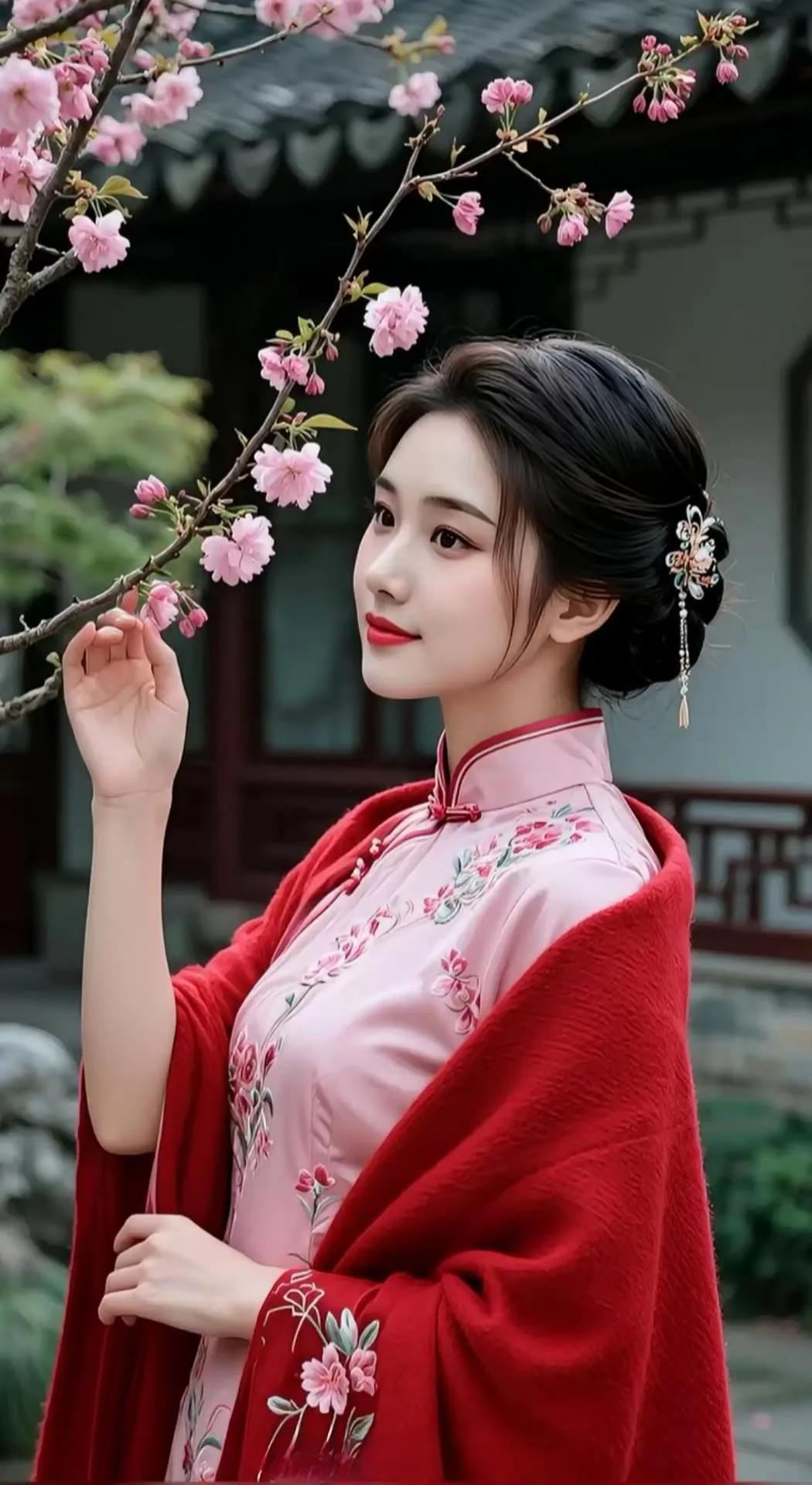 温柔古典的东方美人,粉色旗袍与珍珠项链相得益彰,尽显优雅气质。
