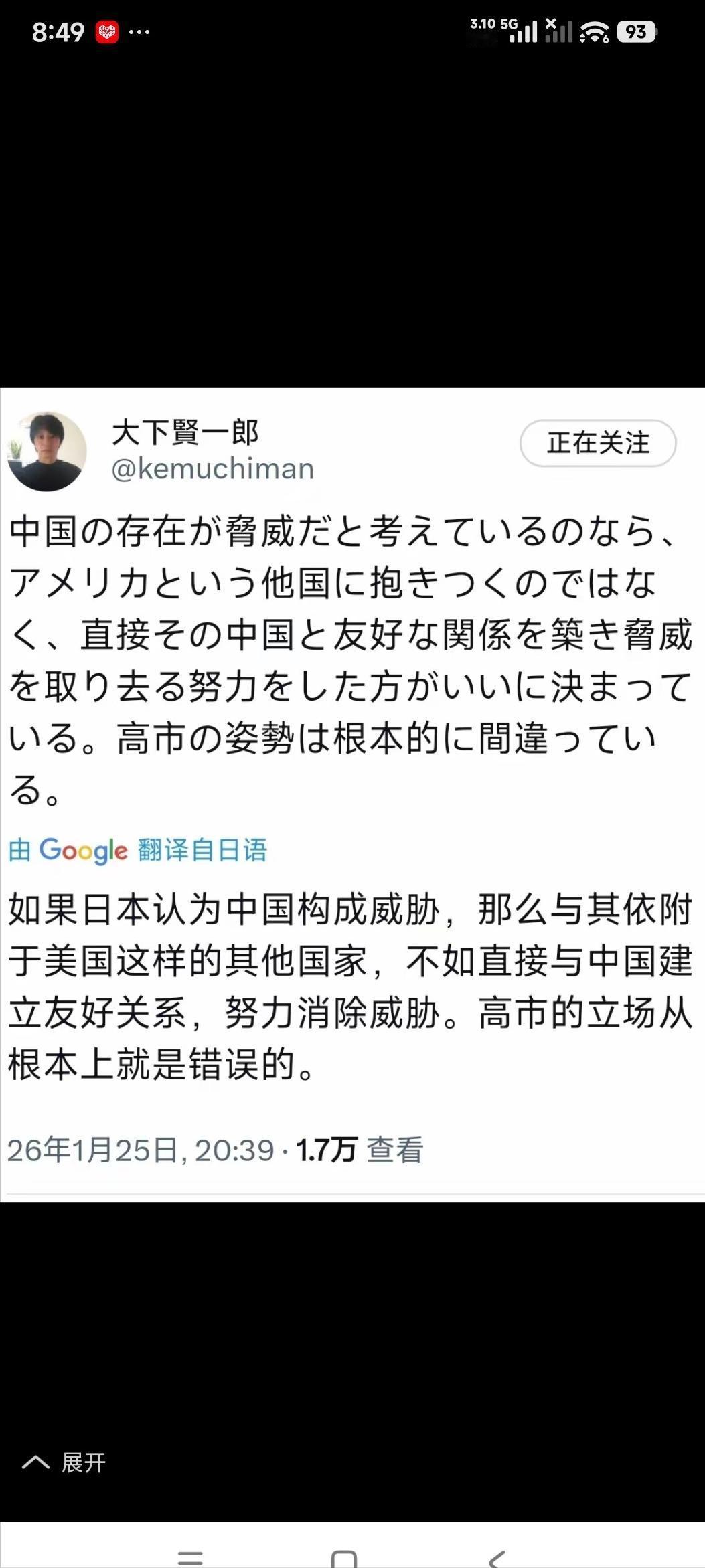 这个日本人的观点在日本社交媒体上炸开了锅。 大下贤一郎指出:“如果日本认为中国构成威胁,那么与其依附于美国这样的其它国家,不如直接与中国建立友好关系,努力消除威胁,高市的立场从根本上就是错误。” 说起来,高市早苗这大半年来的操作确实够离谱。去年11月刚上任首相,就在国会放话称台海冲突可能构成日本的“存亡危机事态”,暗示要动用自卫队介入,这明显是踩着一个中国原则的红线乱蹦。 中方当即就炸了,从外交部副部长到驻日大使接连提出严正交涉,后续还发布了赴日安全预警、暂停进口日本水产品,各大航司也开放了赴日机票免费退改。 2025年12月中国公民赴日人数同比跌了40%,环比也降了35%,日本旅游业算是遭了殃。 可高市早苗非但不收敛,反而在今年1月26日又放厥词,说要是美军在台海被攻击,日本不回应的话美日同盟就会瓦解,还扬言要去“救援日美公民”。 一边对着中国强硬挑衅,一边又说愿意和中国对话,这种自相矛盾的表态,说白了就是想靠着美国撑腰,在台海问题上捞取政治资本,全然不顾中日关系恶化带来的后果。 中方已经加强了对日本军民两用产品的出口管制,还对日本进口的二氯二氢硅发起反倾销调查,稀土出口限制更是精准命中日本制造业的软肋,这些都是对其错误言行的直接反制。 大下贤一郎的话之所以能引发热议,就是因为他点破了日本的尴尬处境。作为和中国一衣带水的邻国,日本根本没法“搬离”亚洲,和中国搞对立,受损的终究是自己。 可现在的日本,更像被美国拴着锁链的“提线木偶”,安全上当马前卒,政治上被裹挟,经济上还得跟着美国的节奏走,明明和中国有广阔的合作空间,却偏偏要往对抗的死胡同里钻。 就像去年12月,日本想派经济代表团访华缓和关系,可连最基本的认错道歉都做不到,中方自然不会给出积极回应。 中日关系要回到正轨,道理很简单,无非就是正视历史、守住底线。高市早苗不仅在台海问题上胡来,还曾称日本当年的侵略是“自卫战争”,否认甲级战犯的罪责,这种歪曲历史的态度,根本不可能赢得中国人民的信任。 中国从来都不是日本的威胁,真正让日本陷入困境的,是其依附美国的霸权思维,以及不敢正视历史、妄图干涉他国内政的野心。 如今日本众议院选举在即,高市早苗解散众议院提前大选,无非是想靠煽动对立转移国内矛盾。但大下贤一郎的言论已经说明,日本国内不乏清醒的声音。 邻居好,赛金宝,这个道理放之四海而皆准。如果日本继续跟着美国一条道走到黑,在错误的道路上越走越远,最终只会被锁链捆得越来越紧,落得个损人不利己的可悲下场。唯有放下执念,真诚道歉认错,和中国建立友好合作关系,才是日本的明智之选。