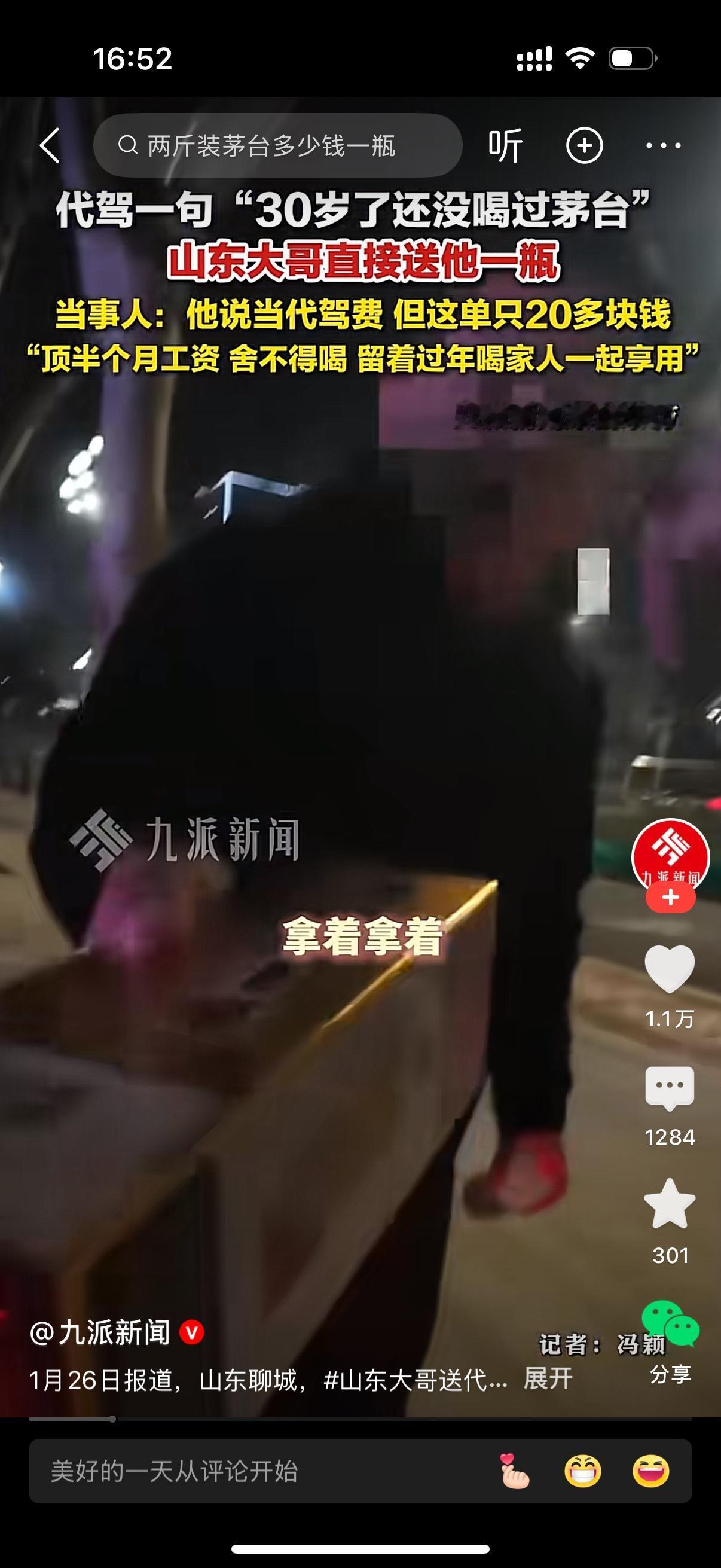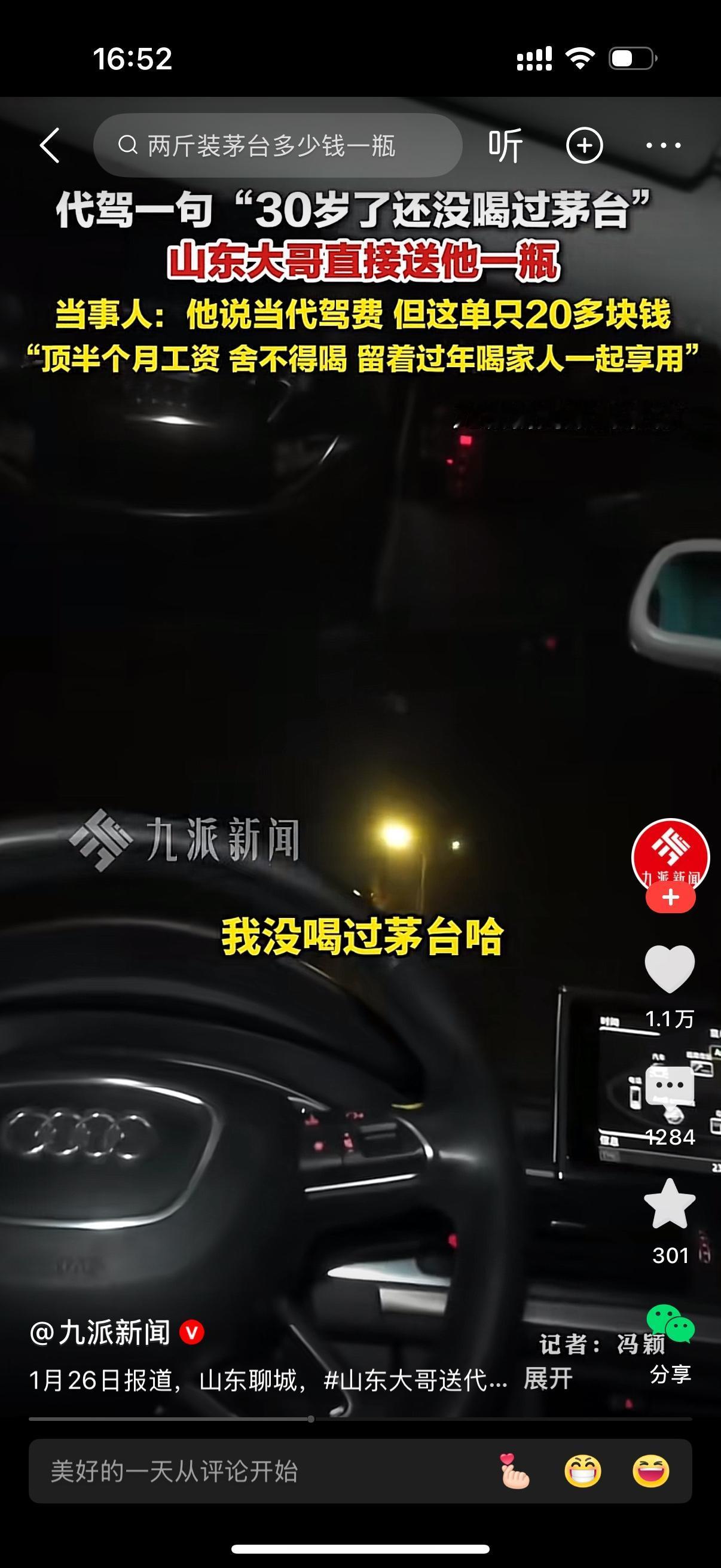 代驾和车主闲聊,说自己30岁了,还没喝过茅台。车主直接送他一瓶茅台,拿着拿着。代驾拒绝,这个太贵重了,我不能要。车主说,拿着,这个就抵代驾费了。茅台拿着喝就行。代驾恭敬不如从命,就收下了。他说代驾费才20块钱,大哥太大方了。这茅台赶上自己半个月工资了。留着过年和家人一起享用。