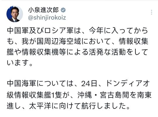 日本防卫大臣小泉进次郎1月26日晚写道:“即使在今年,中国和俄罗斯军队也积极利用情报搜集舰船和飞机在日本周边海域和空域开展活动。 先说说中国那艘东雕级情报搜集船,24日从冲绳和宫古岛之间往东南方向去太平洋,这路线本身就是国际航道,任何主权国家的舰船都有自由航行的权利,既没进日本领海,也没搞任何挑衅动作,规规矩矩得很。 冲绳和宫古岛之间的水道又不是日本家的后花园,中国舰船走这儿再正常不过,说白了就是正常操作,偏偏到了小泉嘴里就成了需要“警惕监视”的事,这双标玩得也太溜了。 日本自己天天派舰船飞机往中国周边跑,搜集情报、搞侦察,怎么到了中国这儿,正常的航行就被说得别有用心?无非就是想把中国塑造成“威胁”,为自己在西南诸岛加码军事部署找借口罢了。 再看俄罗斯的维什尼亚级情报舰,7日经对马海峡南下,12日到24日在先岛群岛和冲绳附近转悠,还被日本说成是“首次确认并公开绕先岛群岛航行”。 先不说对马海峡本就是国际航运要道,俄罗斯舰船经此南下完全符合国际法,就算是绕先岛群岛航行,也全程在国际海域,没越雷池一步。 所谓“首次公开”,更像是日本故意挑个由头刷存在感,暗示俄罗斯“动作升级”,实则就是俄罗斯太平洋舰队常规的远洋活动而已。 维什尼亚级本就是专门搞电子情报搜集的,在国际海域开展工作天经地义,日本却全程盯着,又是跟踪又是记录,恨不得把每一个细节都公之于众,说到底就是想制造“俄罗斯威胁论”,转移国内对其军事扩张的质疑。 最被小泉拿出来说事的,还是俄罗斯那架IL-20情报收集飞机,23日飞越日本海到京都府海岸,26日又飞越太平洋到东北海岸,同一架飞机两天内在日本周边绕着飞,可把日本自卫队忙坏了,又是紧急起飞战斗机,又是全程监视。 但实际上,IL-20作为俄罗斯常用的电子侦察机,这类飞行根本不是什么新鲜事,而且全程都在国际空域,严格遵守了国际飞行规则,连日本自己都没说飞机进入了其领空,说白了就是合法合规的侦察活动。 IL-20的性能摆在那儿,机身装满了各种传感器和雷达,就是专门搞电子信号搜集的,俄罗斯在自己周边的国际空域开展这类活动,完全是主权范围内的事,轮不到日本指手画脚。 日本嘴里说“这些活动可能是为了收集某种信息”,这话跟废话没区别,情报搜集船和侦察机的用途本来就是干这个的,中俄军队在国际海域空域开展这类活动,光明正大,不像有些国家,搞侦察还偷偷摸摸,反而倒打一耙。 更可笑的是日本自卫队的反应,“全国各地的部队都在进行监视和战斗机紧急起飞”,搞得跟天要塌下来一样,实际上就是作秀给国内和美国看。 要知道,俄罗斯的IL-20每次在日本周边飞行,日本自卫队都要紧急升空战机,可每次都只是远远跟着,不敢有任何实质性动作,说白了就是演给外界看,证明自己“反应迅速、防卫到位”,骨子里还是色厉内荏。 小泉最后还放狠话,说要“采取一切可能的措施,确保警惕和监视”,这话听着硬气,实则根本站不住脚。 中俄两军的活动全程公开透明,严格遵守国际法,既不针对第三方,也没威胁到日本的安全,反倒是日本,近年来不断在西南诸岛加码军事部署,部署导弹、扩充驻军,还动不动就跟美国搞联合军演,把周边局势搞得越来越紧张。 日本之所以这么热衷于炒作中俄周边活动,核心就是想借“外部威胁”为自己突破和平宪法、扩充军力找借口,毕竟这些年日本一直想摆脱战后束缚,成为所谓的“军事大国”,中俄自然就成了它最好的“假想敌”。 而且日本心里比谁都清楚,中俄根本不是什么“威胁”,所谓的“警惕监视”,更多是做给美国看的,想靠渲染地区紧张,巩固日美同盟,换取美国在军事和政治上的支持。 可事实摆在那儿,中俄两军的合作和活动,本质上是为了维护地区和平稳定,跟日本搞的那些小动作完全不是一回事。 日本天天盯着中俄的正常活动大惊小怪,却对自己的军事扩张避而不谈,这种双重标准,明眼人都能看明白。 说白了,小泉进次郎这篇发文,就是一场精心策划的政治秀,既想在国内树立自己“强硬防卫大臣”的形象,又想借机炒作外部威胁,为日本的军事扩张铺路。 可中俄根本不吃这一套,该在国际海域空域开展活动照样开展,日本就算天天紧急起飞战斗机、全程监视,也改变不了什么。 反而只会让周边国家看清日本的真实意图,进一步破坏地区的和平稳定,最后搬起石头砸自己的脚。 日本与其天天盯着中俄找存在感,不如好好反思一下自己的所作所为,停止搞阵营对抗、渲染紧张气氛,踏踏实实为地区和平做点实事,别再干这种自欺欺人的事了。